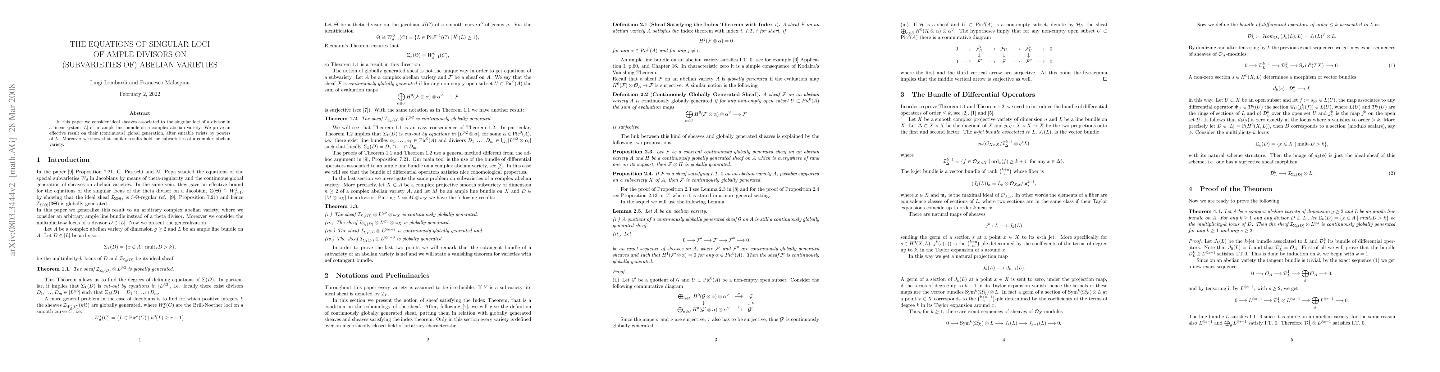 In this paper we consider ideal sheaves associated to the singular loci of a divisor in a linear system $|L|$ of an ample line bundle on a complex abelian variety. We prove an effective result on their (continuous) global generation, after suitable twists by powers of $L$. Moreover we show that similar results hold for subvarieties of a complex abelian variety.