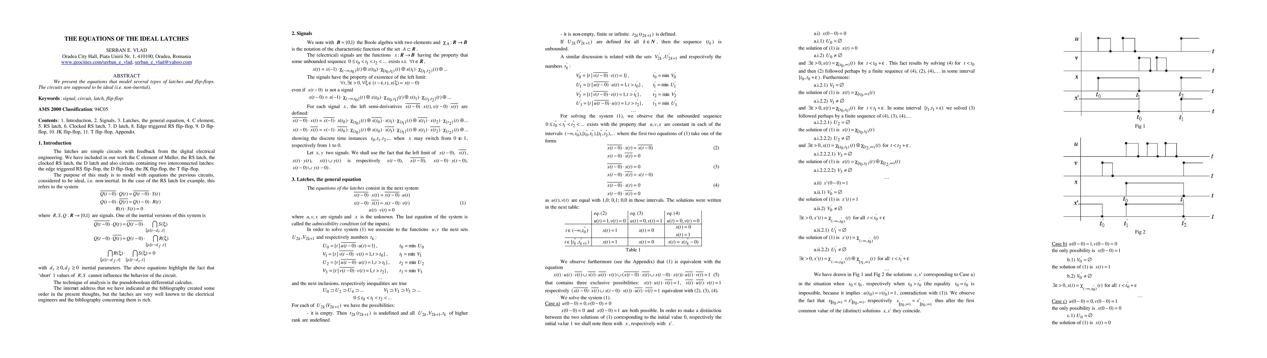 The latches are simple circuits with feedback from the digital electrical engineering. We have included in our work the C element of Muller, the RS latch, the clocked RS latch, the D latch and also circuits containing two interconnected latches: the edge triggered RS flip-flop, the D flip-flop, the JK flip-flop, the T flip-flop. The purpose of this study is to model with equations the previous circuits, considered to be ideal, i.e. non-inertial. The technique of analysis is the pseudoboolean differential calculus.