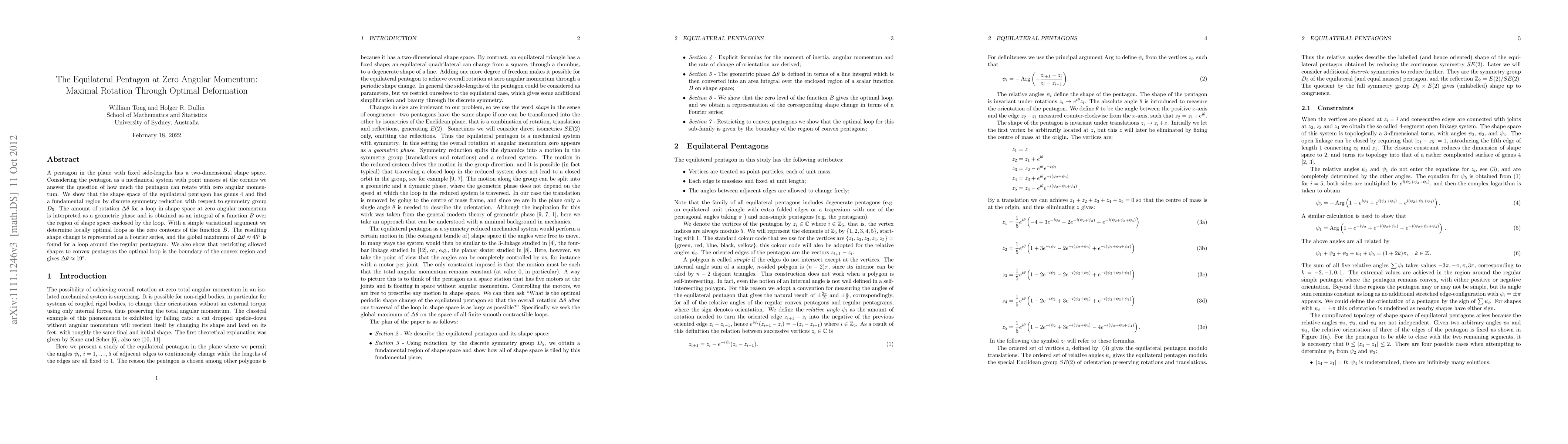 A pentagon in the plane with fixed side-lengths has a two-dimensional shape space. Considering the pentagon as a mechanical system with point masses at the corners we answer the question of how much the pentagon can rotate with zero angular momentum. We show that the shape space of the equilateral pentagon has genus 4 and find a fundamental region by discrete symmetry reduction with respect to symmetry group D_5. The amount of rotation \Delta \theta for a loop in shape space at zero angular momentum is interpreted as a geometric phase and is obtained as an integral of a function B over the region of shape space enclosed by the loop. With a simple variational argument we determine locally optimal loops as the zero contours of the function B. The resulting shape change is represented as a Fourier series, and the global maximum of \Delta \theta \approx 45\degree is found for a loop around the regular pentagram. We also show that restricting allowed shapes to convex pentagons the optimal loop is the boundary of the convex region and gives \Delta \theta \approx 19\degree.
