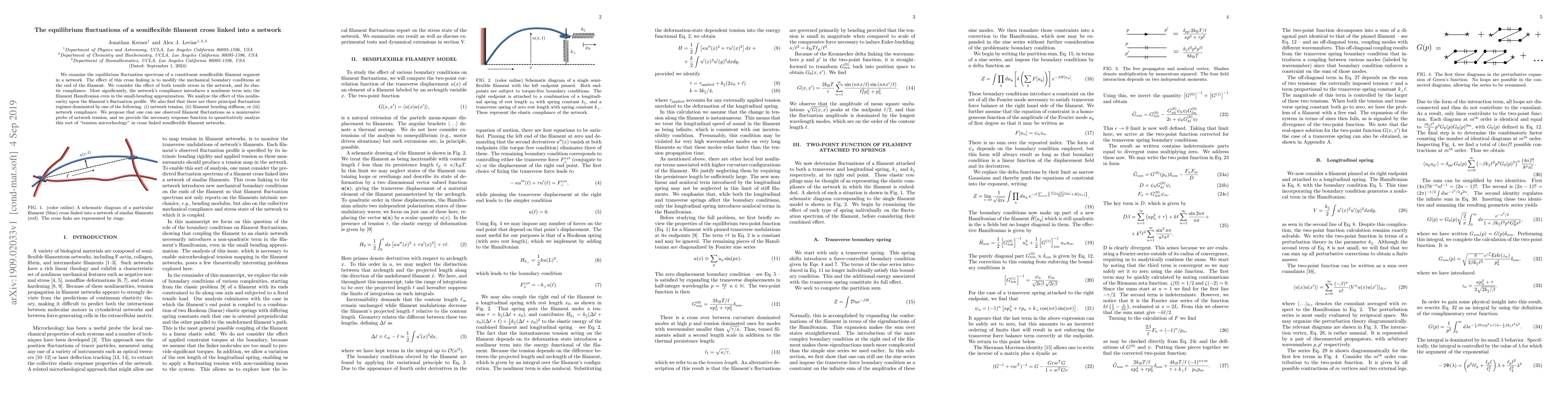 This paper investigates the equilibrium fluctuations of semiflexible filaments in a cross-linked network, revealing how network compliance introduces a nonlinear term in the filament's Hamiltonian. It identifies three fluctuation regimes dominated by network tension, filament stiffness, or network compliance, and proposes using filament fluctuations as a probe for network tension.