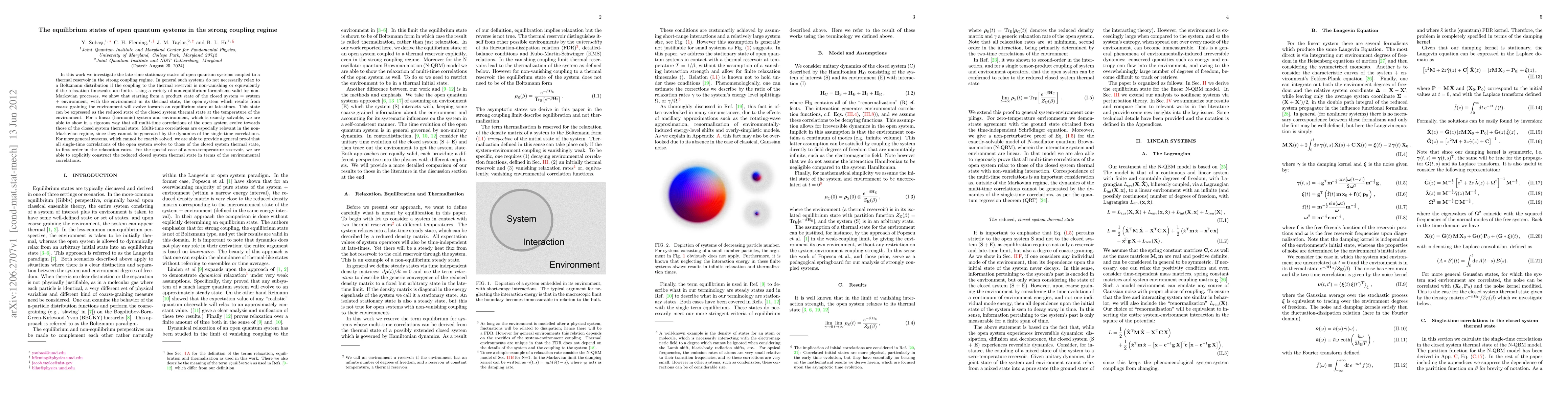 In this work we investigate the late-time stationary states of open quantum systems coupled to a thermal reservoir in the strong coupling regime. In general such systems do not necessarily relax to a Boltzmann distribution if the coupling to the thermal reservoir is non-vanishing or equivalently if the relaxation timescales are finite. Using a variety of non-equilibrium formalisms valid for non-Markovian processes, we show that starting from a product state of the closed system = system + environment, with the environment in its thermal state, the open system which results from coarse graining the environment will evolve towards an equilibrium state at late-times. This state can be expressed as the reduced state of the closed system thermal state at the temperature of the environment. For a linear (harmonic) system and environment, which is exactly solvable, we are able to show in a rigorous way that all multi-time correlations of the open system evolve towards those of the closed system thermal state. Multi-time correlations are especially relevant in the non-Markovian regime, since they cannot be generated by the dynamics of the single-time correlations. For more general systems, which cannot be exactly solved, we are able to provide a general proof that all single-time correlations of the open system evolve to those of the closed system thermal state, to first order in the relaxation rates. For the special case of a zero-temperature reservoir, we are able to explicitly construct the reduced closed system thermal state in terms of the environmental correlations.
