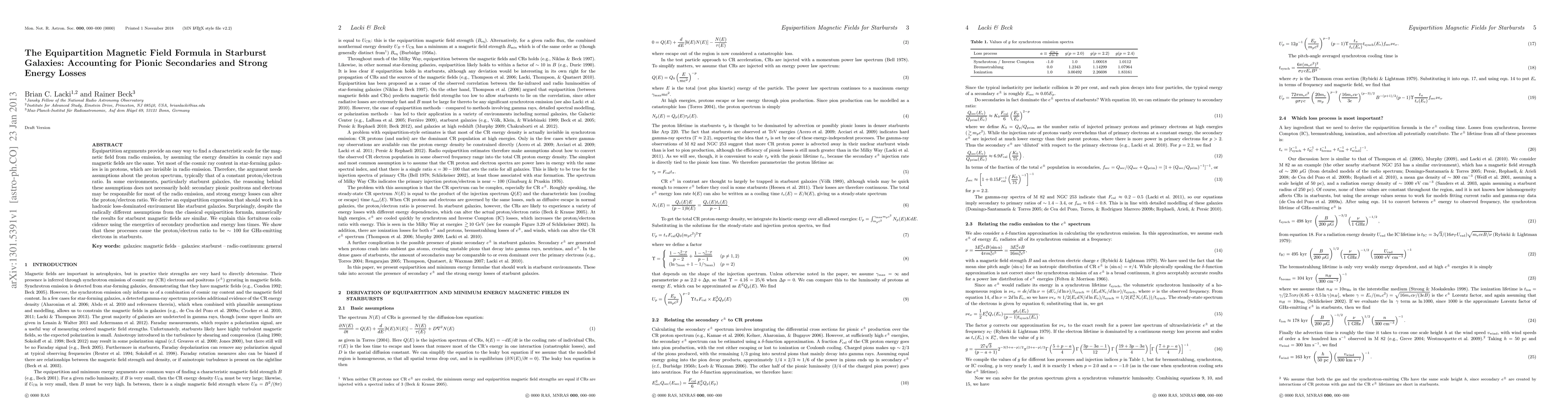 This paper proposes a revised equipartition formula for magnetic fields in starburst galaxies, accounting for pionic secondaries and strong energy losses. Despite differing assumptions, the new formula yields similar magnetic field estimates as the classical equipartition method, explained by the energetics of secondary production and energy loss.