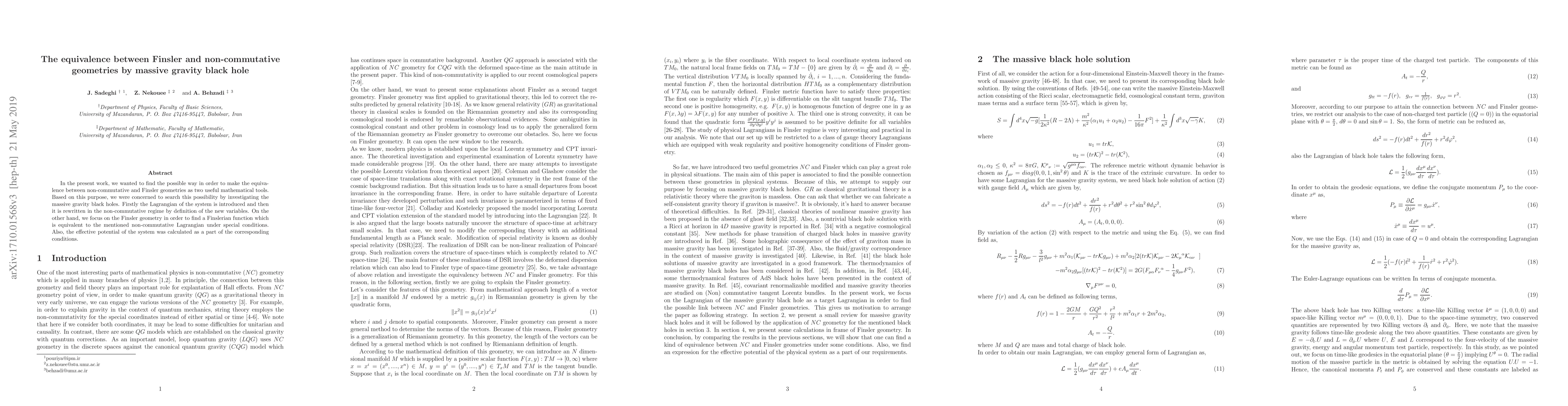 This paper explores the equivalence between non-commutative and Finsler geometries through the lens of massive gravity black holes. It introduces the Lagrangian of the system, rewrites it in the non-commutative regime, and seeks a Finslerian function equivalent to the non-commutative Lagrangian under specific conditions, alongside calculating the effective potential.