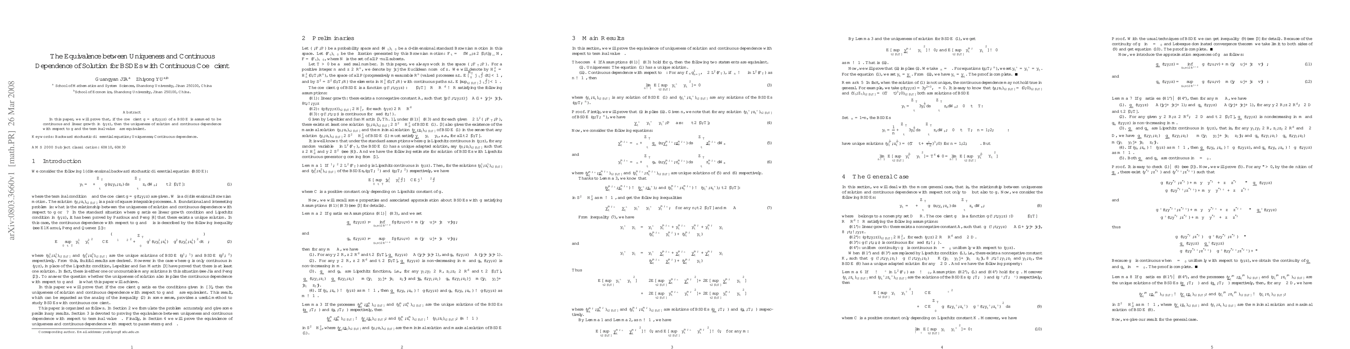 In this paper, we will prove that, if the coefficient $g=g(t,y,z)$ of a BSDE is assumed to be continuous and linear growth in $(y,z)$, then the uniqueness of solution and continuous dependence with respect to $g$ and the terminal value $\xi$ are equivalent.