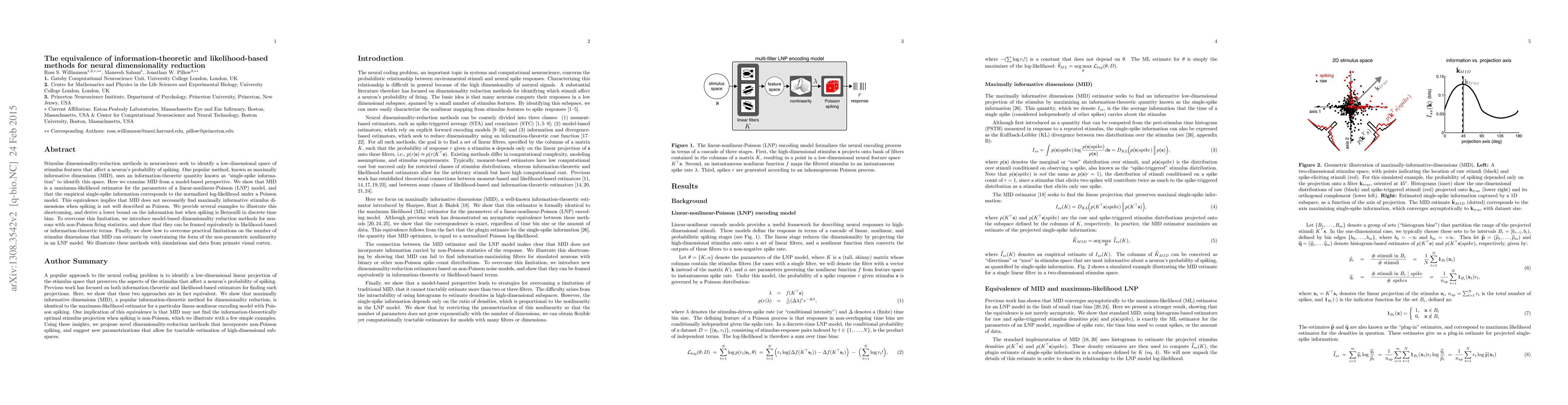 This paper explores the equivalence between information-theoretic and likelihood-based methods for neural dimensionality reduction, showing that the MID method is a maximum-likelihood estimator for a linear-nonlinear-Poisson model. It highlights limitations when spiking is not Poissonian and proposes new model-based methods for non-Poisson firing statistics.
