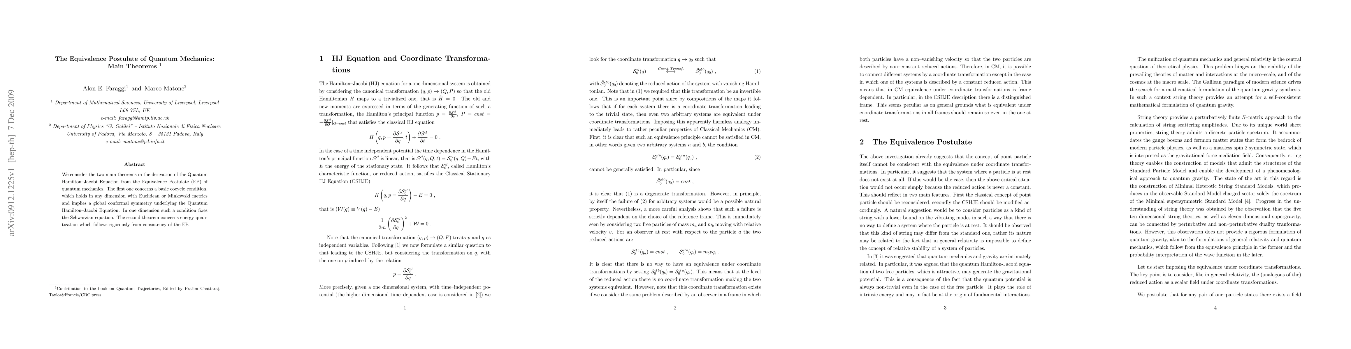 We consider the two main theorems in the derivation of the Quantum Hamilton--Jacobi Equation from the Equivalence Postulate (EP) of quantum mechanics. The first one concerns a basic cocycle condition, which holds in any dimension with Euclidean or Minkowski metrics and implies a global conformal symmetry underlying the Quantum Hamilton--Jacobi Equation. In one dimension such a condition fixes the Schwarzian equation. The second theorem concerns energy quantization which follows rigorously from consistency of the equivalence postulate.