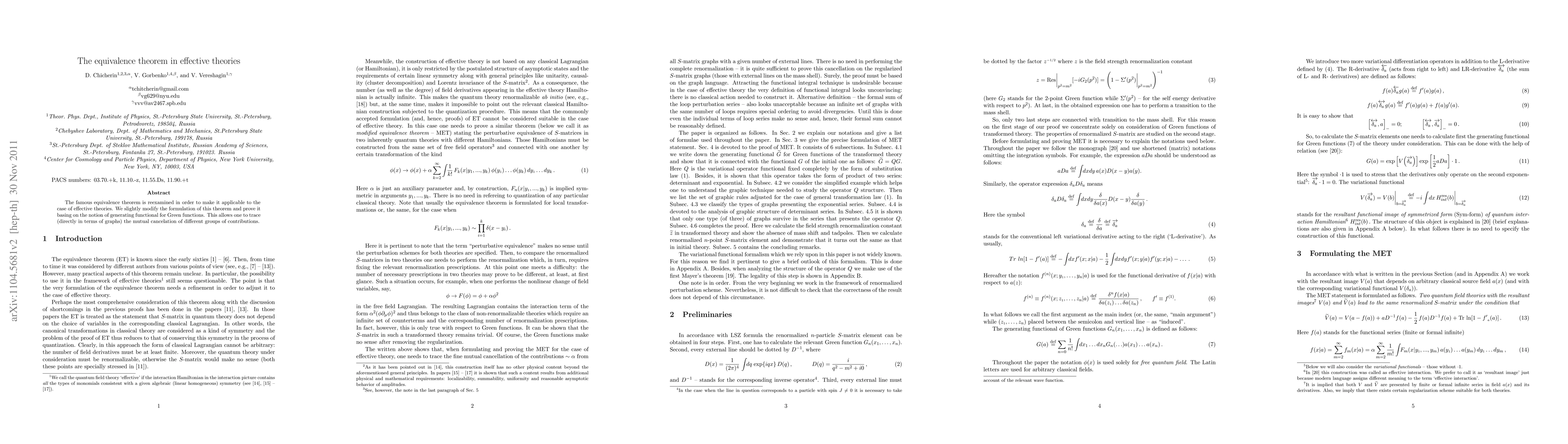 The paper reexamines the equivalence theorem for quantum effective theories, slightly modifying its formulation and proving it using the generating functional for Green functions to demonstrate the mutual cancellation of different contributions in terms of graphs.