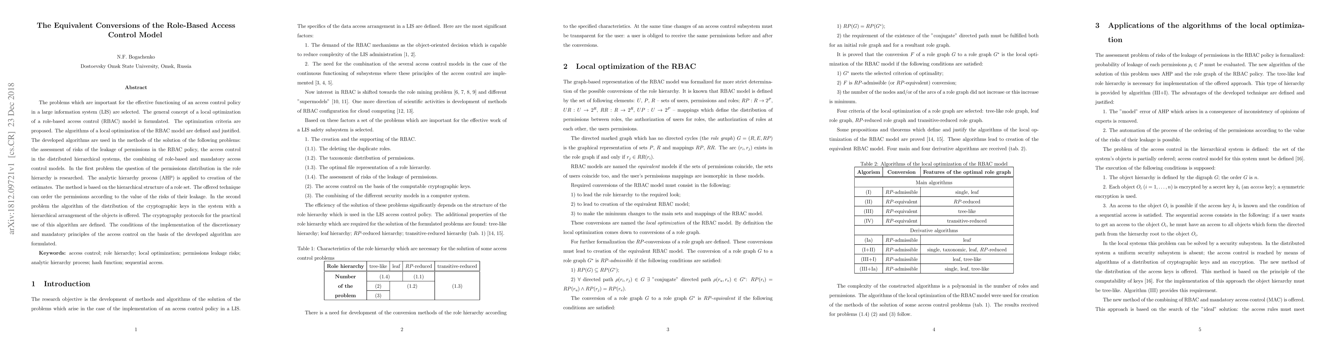 This paper proposes optimization criteria and algorithms for the role-based access control (RBAC) model, focusing on risk assessment for permission leakage and access control in distributed hierarchical systems. It utilizes the analytic hierarchy process (AHP) and cryptographic keys distribution to enhance security.