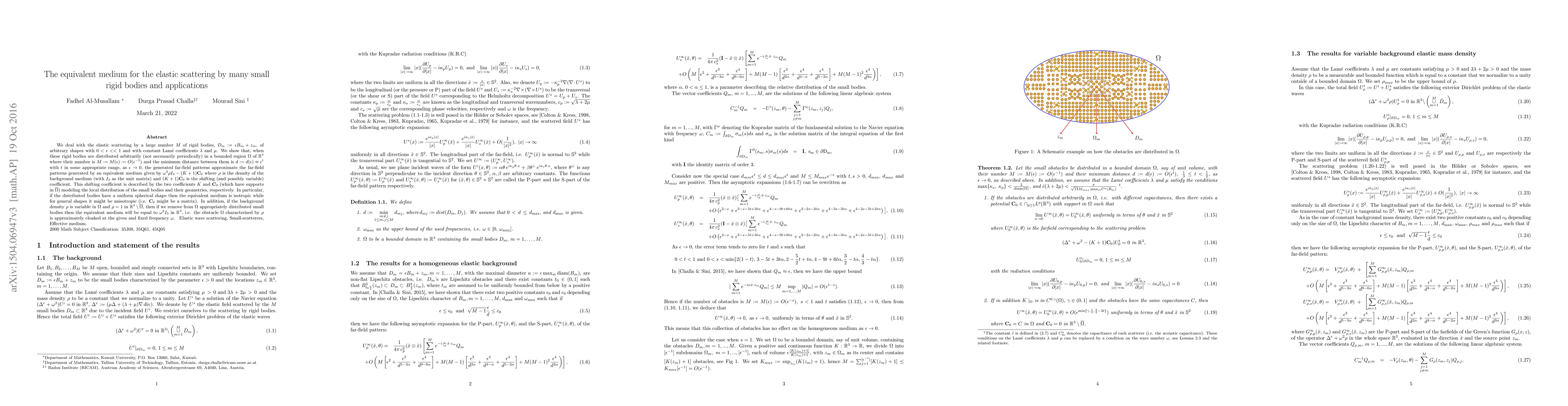 We deal with the elastic scattering by a large number $M$ of rigid bodies, $D_m:=\epsilon B_m+z_m$, of arbitrary shapes with $ 0<\textcolor{black}{\epsilon}<<1$ and with constant Lam\'e coefficients $\lambda$ and $\mu$. We show that, when these rigid bodies are distributed arbitrarily (not necessarily periodically) in a bounded region $\Omega$ of $\mathbb{R}^3$ where their number is $M:=M(\textcolor{black}{\epsilon}):=O(\textcolor{black}{\epsilon}^{-1})$ and the minimum distance between them is $d:=d(\textcolor{black}{\epsilon})\approx \textcolor{black}{\epsilon}^{t}$ with $t$ in some appropriate range, as $\textcolor{black}{\epsilon} \rightarrow 0$, the generated far-field patterns approximate the far-field patterns generated by an equivalent medium given by $\omega^2\rho I_3-(K+1)\mathbf{C}_0 $ where $\rho$ is the density of the background medium (with $I_3$ as the unit matrix) and $(K+1)\mathbf{C}_0$ is the shifting (and possibly variable) coefficient. This shifting coefficient is described by the two coefficients $K$ and $\mathbf{C}_0$ (which have supports in $\overline{\Omega}$) modeling the local distribution of the small bodies and their geometries, respectively. In particular, if the distributed bodies have a uniform spherical shape then the equivalent medium is isotropic while for general shapes it might be anisotropic (i.e. $\mathbf{C}_0$ might be a matrix). In addition, if the background density $\rho$ is variable in $\Omega$ and $\rho =1$ in $\mathbb{R}^3\setminus{\overline{\Omega}}$, then if we remove from $\Omega$ appropriately distributed small bodies then the equivalent medium will be equal to $\omega^2 I_3$ in $\mathbb{R}^3$, i.e. the obstacle $\Omega$ characterized by $\rho$ is approximately cloaked at the given and fixed frequency $\omega$.