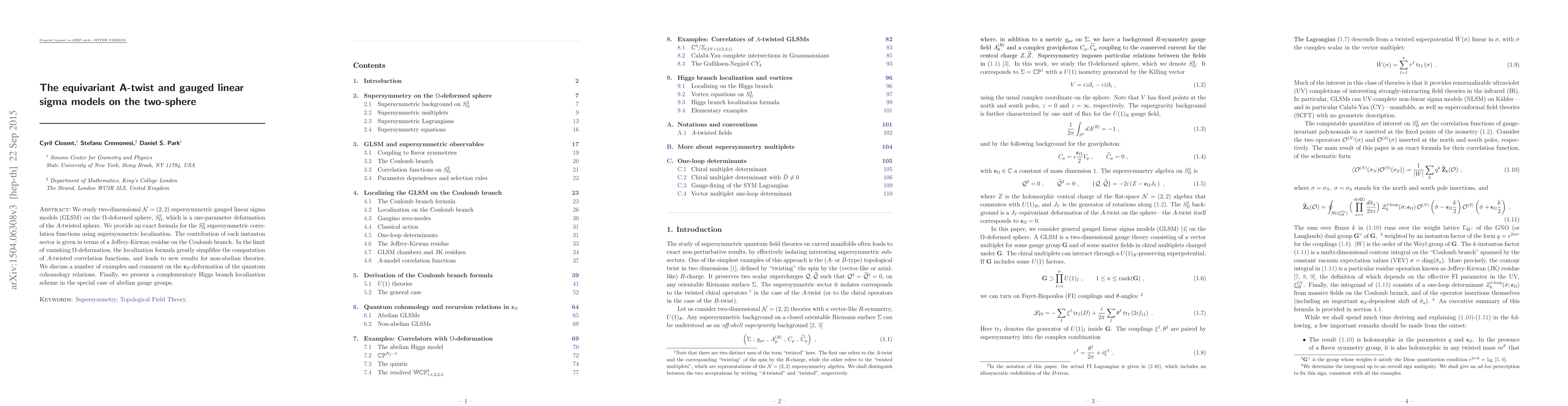 This paper investigates $\mathcal{N}=(2,2)$ supersymmetric gauged linear sigma models on a deformed two-sphere, providing exact formulas for supersymmetric correlation functions via localization. It simplifies $A$-twisted correlation function computations and introduces new results for non-abelian theories.