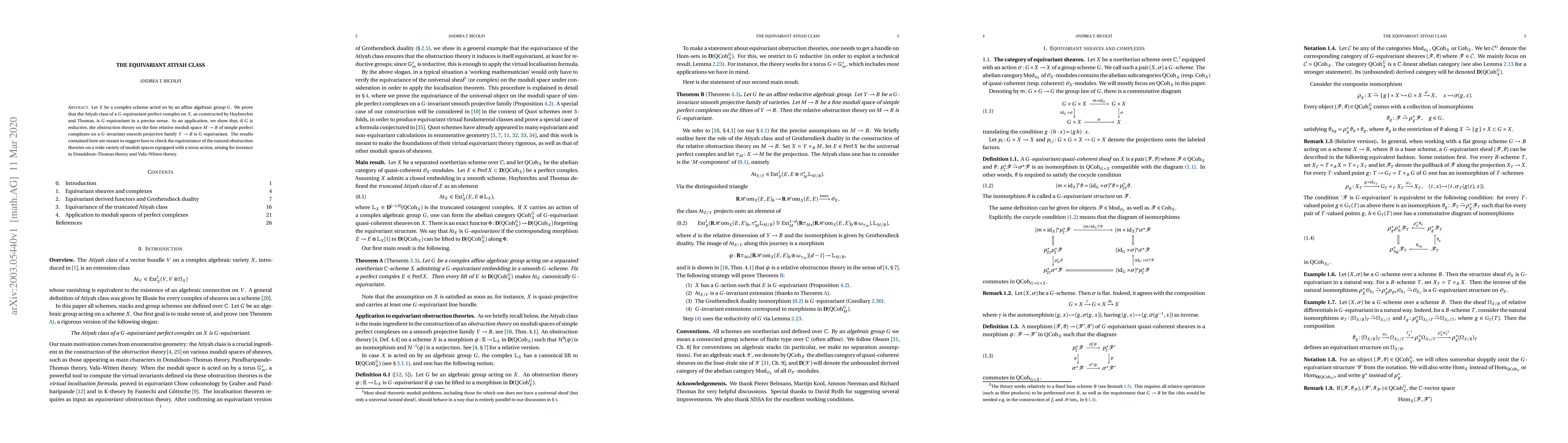 Let $X$ be a complex scheme acted on by an affine algebraic group $G$. We prove that the Atiyah class of a $G$-equivariant perfect complex on $X$, as constructed by Huybrechts and Thomas, is $G$-equivariant in a precise sense. As an application, we show that, if $G$ is reductive, the obstruction theory on the fine relative moduli space $M\to B$ of simple perfect complexes on a $G$-invariant smooth projective family $Y\to B$ is $G$-equivariant. The results contained here are meant to suggest how to check the equivariance of the natural obstruction theories on a wide variety of moduli spaces equipped with a torus action, arising for instance in Donaldson--Thomas theory and Vafa--Witten theory.