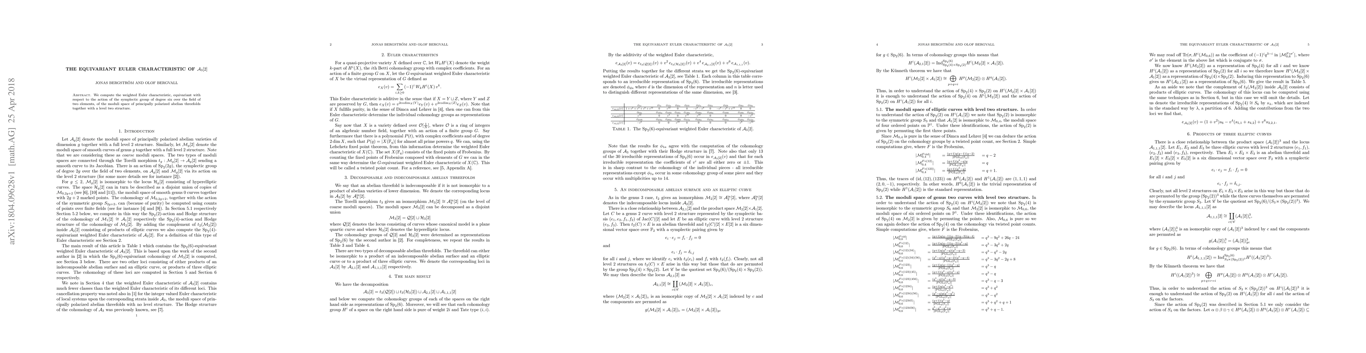 We compute the weighted Euler characteristic, equivariant with respect to the action of the symplectic group of degree six over the field of two elements, of the moduli space of principally polarized abelian threefolds together with a level two structure.
