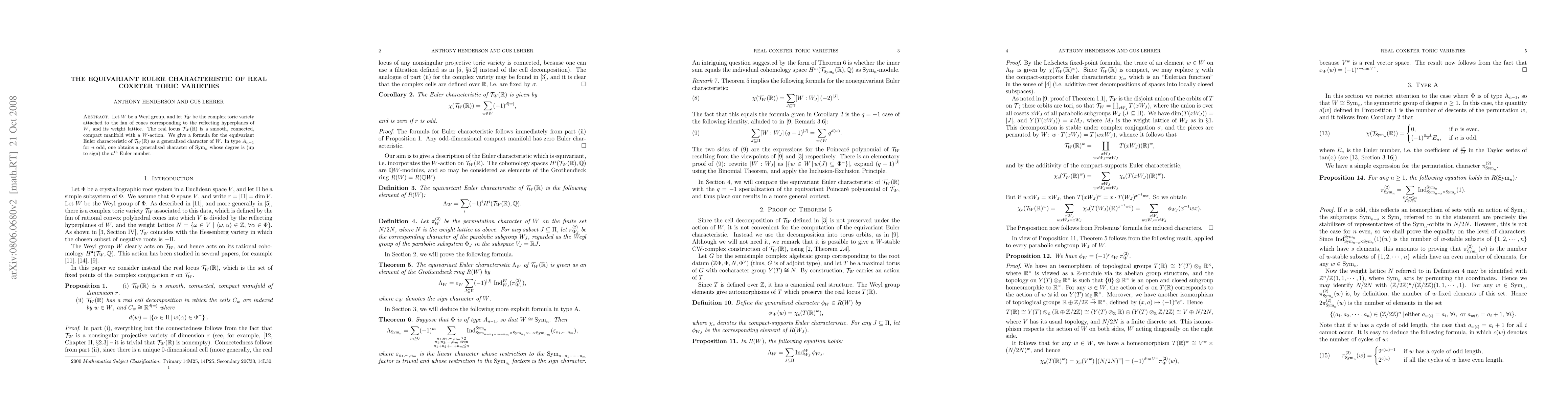 Let $W$ be a Weyl group, and let $\CT_W$ be the complex toric variety attached to the fan of cones corresponding to the reflecting hyperplanes of $W$, and its weight lattice. The real locus $\CT_W(\R)$ is a smooth, connected, compact manifold with a $W$-action. We give a formula for the equivariant Euler characteristic of $\CT_W(\R)$ as a generalised character of $W$. In type $A_{n-1}$ for $n$ odd, one obtains a generalised character of $\Sym_n$ whose degree is (up to sign) the $n^{\text{th}}$ Euler number.