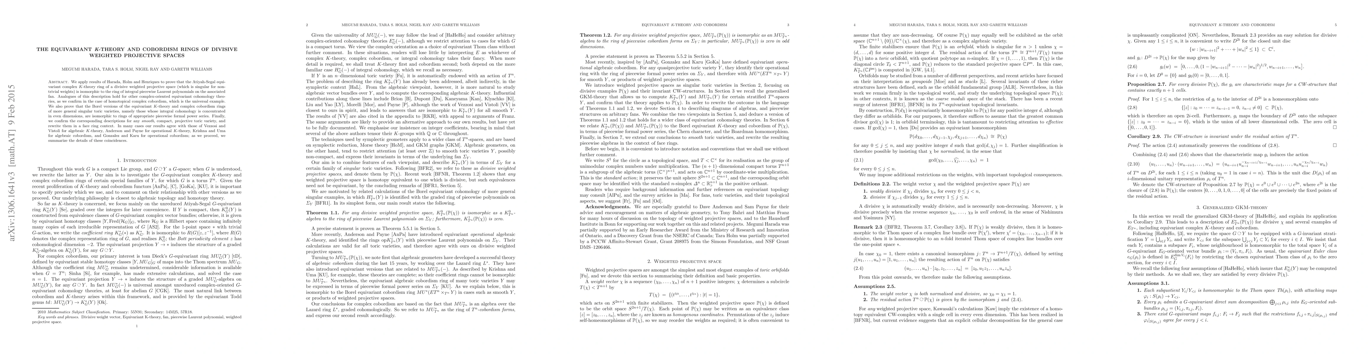 This paper proves that the equivariant $K$-theory and cobordism rings of divisive weighted projective spaces are isomorphic to rings of integral piecewise Laurent polynomials. It extends these results to other complex-oriented equivariant cohomology theories and confirms the descriptions for smooth, compact, projective toric varieties.