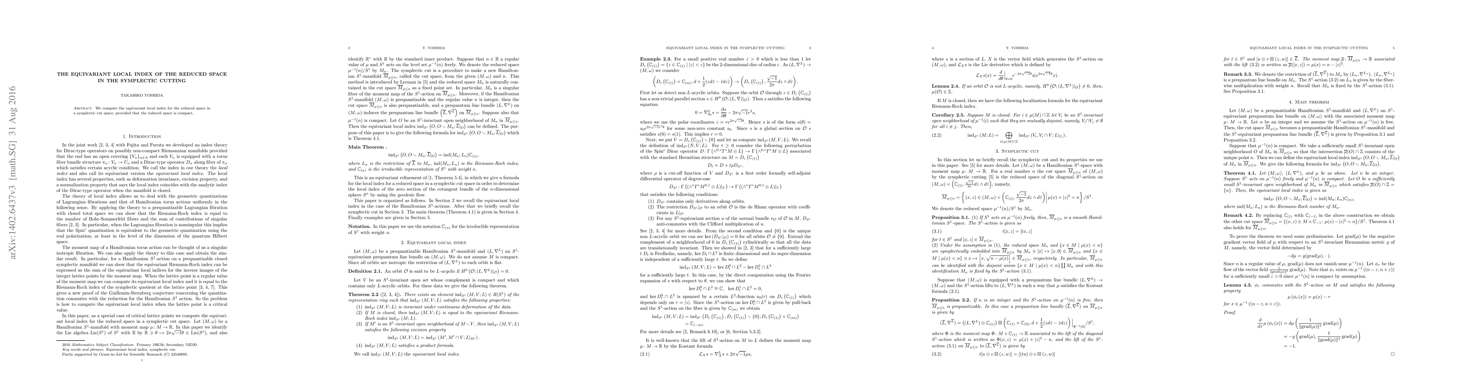 Summary: This paper calculates the equivariant local index for a compact reduced space resulting from a symplectic cutting process, focusing on its mathematical properties and implications. The findings provide insights into the geometric and topological characteristics of the reduced space under consideration.