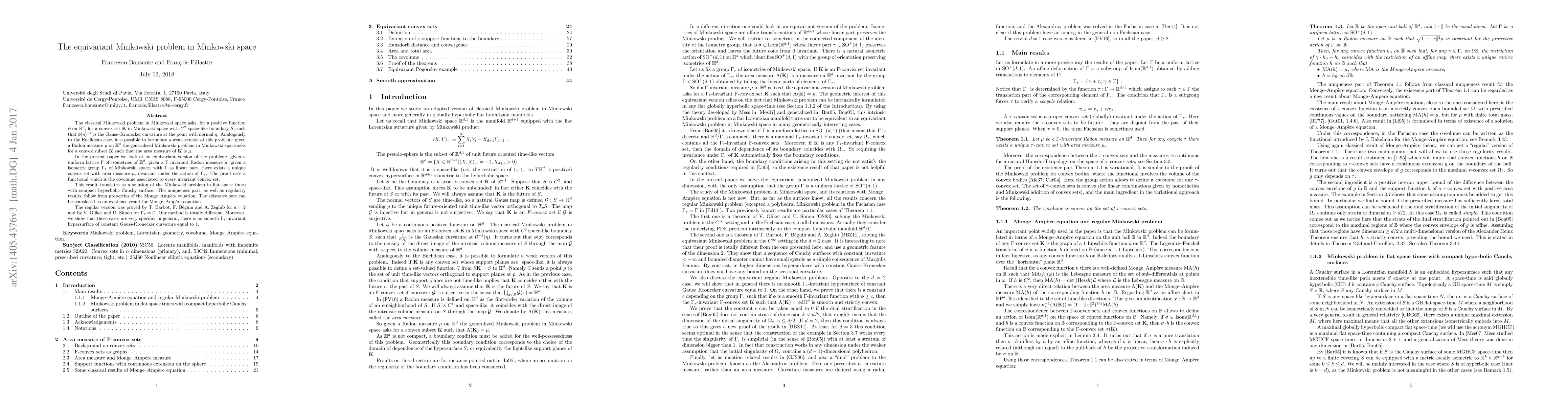 The classical Minkowski problem in Minkowski space asks, for a positive function $\phi$ on $\mathbb{H}^d$, for a convex set $K$ in Minkowski space with $C^2$ space-like boundary $S$, such that $\phi(\eta)^{-1}$ is the Gauss--Kronecker curvature at the point with normal $\eta$. Analogously to the Euclidean case, it is possible to formulate a weak version of this problem: given a Radon measure $\mu$ on $\mathbb{H}^d$ the generalized Minkowski problem in Minkowski space asks for a convex subset $K$ such that the area measure of $K$ is $\mu$. In the present paper we look at an equivariant version of the problem: given a uniform lattice $\Gamma$ of isometries of $\mathbb{H}^d$, given a $\Gamma$ invariant Radon measure $\mu$, given a isometry group $\Gamma_{\tau}$ of Minkowski space, with $\Gamma$ as linear part, there exists a unique convex set with area measure $\mu$, invariant under the action of $\Gamma_{\tau}$. The proof uses a functional which is the covolume associated to every invariant convex set. This result translates as a solution of the Minkowski problem in flat space times with compact hyperbolic Cauchy surface. The uniqueness part, as well as regularity results, follow from properties of the Monge--Amp\`ere equation. The existence part can be translated as an existence result for Monge--Amp\`ere equation. The regular version was proved by T.~Barbot, F.~B\'eguin and A.~Zeghib for $d=2$ and by V.~Oliker and U.~Simon for $\Gamma_{\tau}=\Gamma$. Our method is totally different. Moreover, we show that those cases are very specific: in general, there is no smooth $\Gamma_\tau$-invariant surface of constant Gauss-Kronecker curvature equal to $1$.