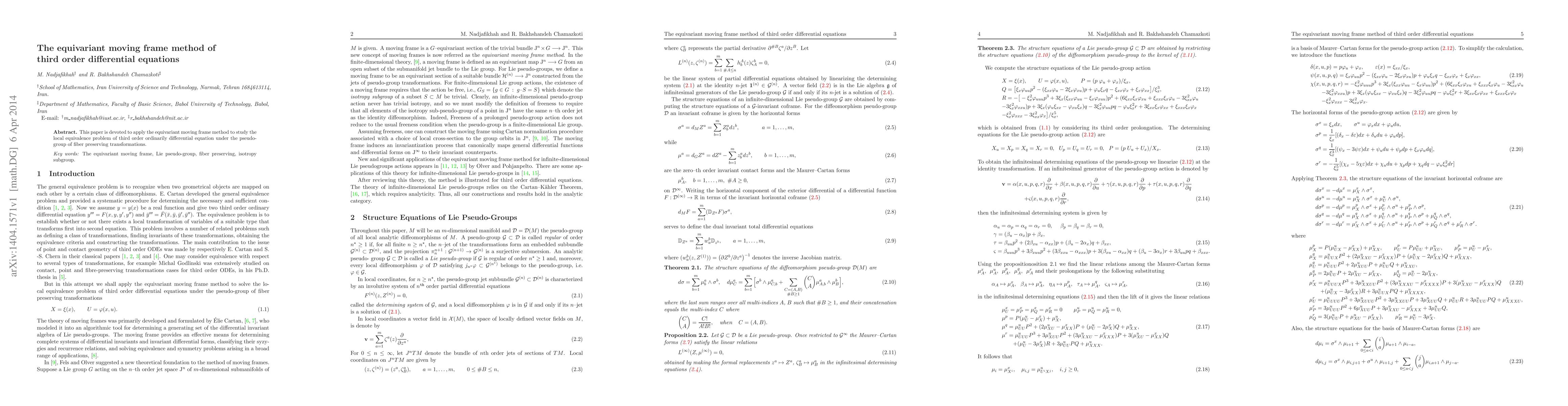 Summary: This paper applies the equivariant moving frame method to investigate the local equivalence of third-order ordinary differential equations under fiber-preserving transformations, focusing on the pseudo-group structure.