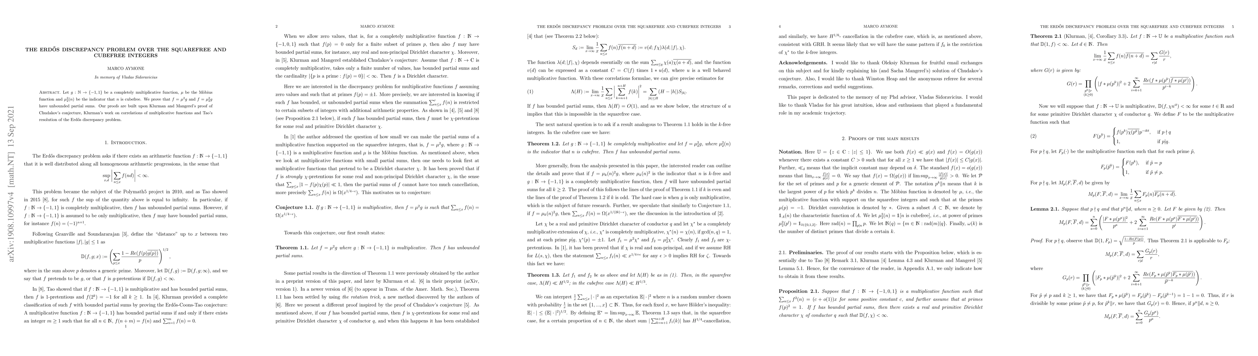 Let $g:\mathbb{N}\to\{-1,1\}$ be a completely multiplicative function, $\mu$ be the M\"obius function and $\mu_2^2(n)$ be the indicator that $n$ is cubefree. We prove that $f=\mu^2g$ and $f=\mu_2^2g$ have unbounded partial sums. Our proofs are built upon Klurman and Mangerel's proof of Chudakov's conjecture, Klurman's work on correlations of multiplicative functions and Tao's resolution of the Erd\H{o}s discrepancy problem.