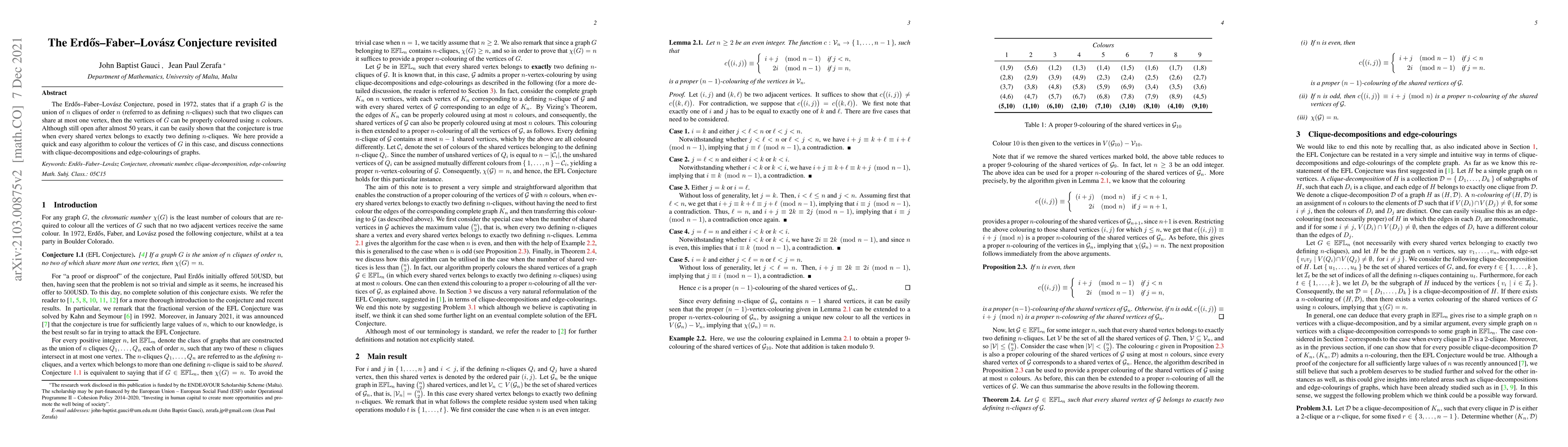 The Erdős--Faber--Lovász Conjecture from 1972 remains unproven, positing that a graph formed by $n$ $n$-cliques with at most one shared vertex per pair can be properly coloured using $n$ colours. An algorithm is presented here to colour such graphs where each shared vertex belongs to exactly two $n$-cliques, exploring links to clique-decompositions and edge-colourings.