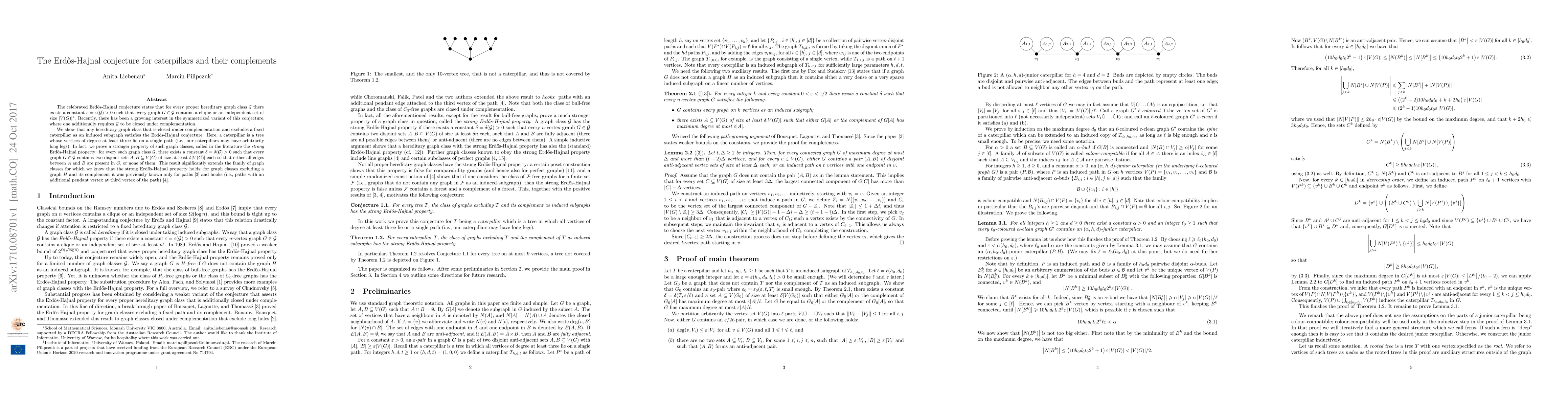 The paper demonstrates that hereditary graph classes closed under complementation and excluding a fixed caterpillar as an induced subgraph satisfy the strong Erdős-Hajnal conjecture, which asserts the presence of large complete or empty subgraphs. This extends prior results known only for paths and hooks.