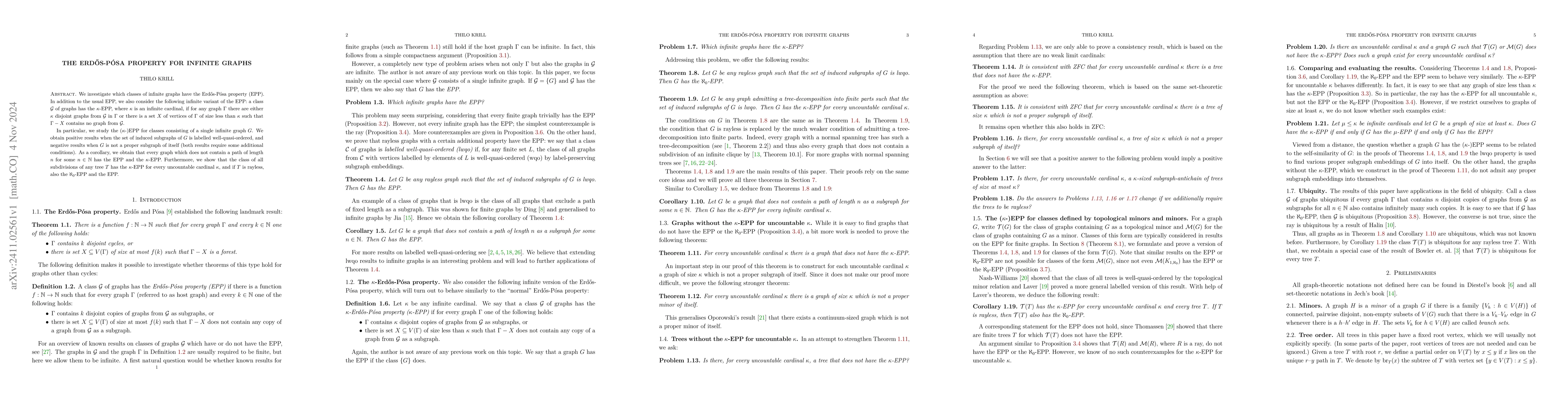 This paper explores the Erdős-Pósa property (EPP) in infinite graph classes, introducing a cardinality-based variant ($\kappa$-EPP). It finds positive results for classes of infinite graphs with well-quasi-ordered induced subgraphs and negative results for those not being proper subgraphs of themselves. The study concludes that graphs avoiding long paths and all tree subdivisions possess the EPP and $\kappa$-EPP.