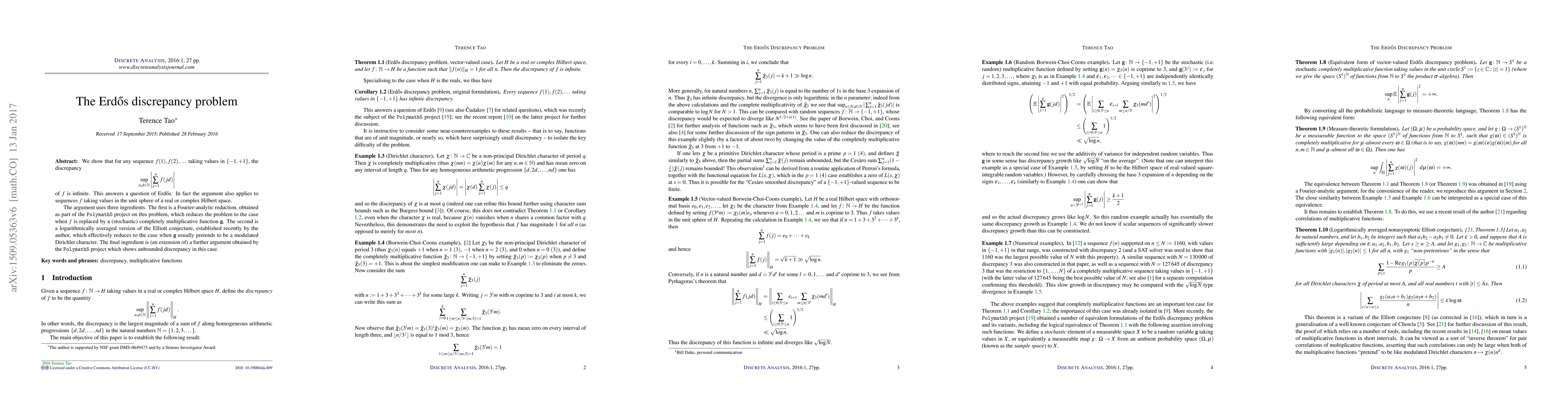 We show that for any sequence $f: {\bf N} \to \{-1,+1\}$ taking values in $\{-1,+1\}$, the discrepancy $$ \sup_{n,d \in {\bf N}} \left|\sum_{j=1}^n f(jd)\right| $$ of $f$ is infinite. This answers a question of Erd\H{o}s. In fact the argument also applies to sequences $f$ taking values in the unit sphere of a real or complex Hilbert space. The argument uses three ingredients. The first is a Fourier-analytic reduction, obtained as part of the Polymath5 project on this problem, which reduces the problem to the case when $f$ is replaced by a (stochastic) completely multiplicative function ${\bf g}$. The second is a logarithmically averaged version of the Elliott conjecture, established recently by the author, which effectively reduces to the case when ${\bf g}$ usually pretends to be a modulated Dirichlet character. The final ingredient is (an extension of) a further argument obtained by the Polymath5 project which shows unbounded discrepancy in this case.