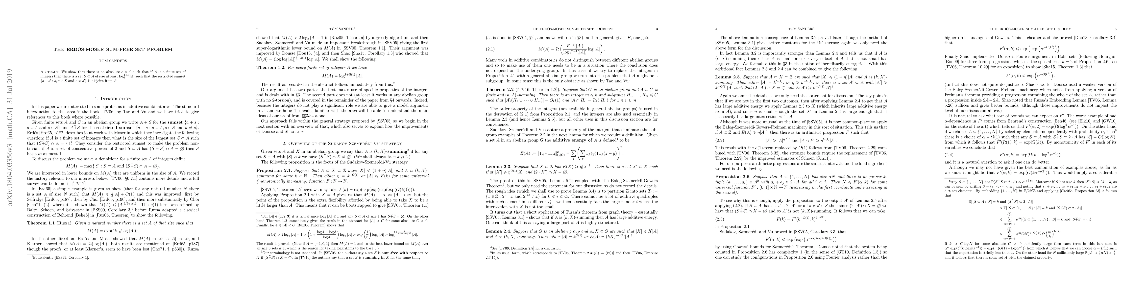 This research demonstrates that any finite set of integers contains a subset of size at least logarithmic in the set's size, where no two distinct elements' sums are in the original set. It applies to the Erdos-Moser sum-free set problem.