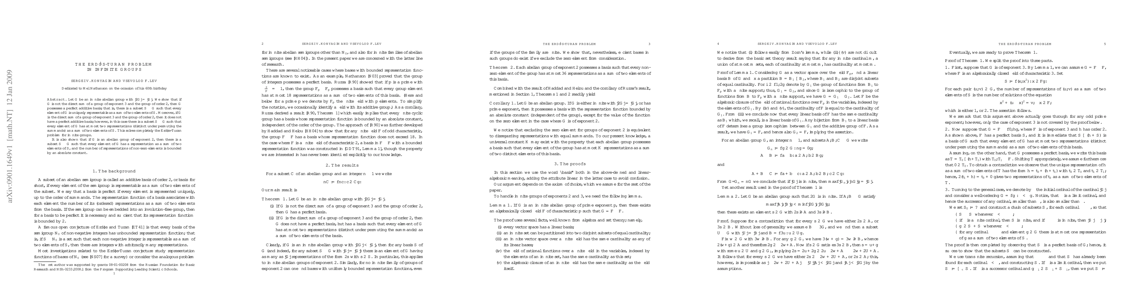 The research paper solves the Erdos-Turan problem for infinite groups, finding that certain conditions on group structure guarantee the existence of a unique additive representation for every element, while others result in at most two representations.
