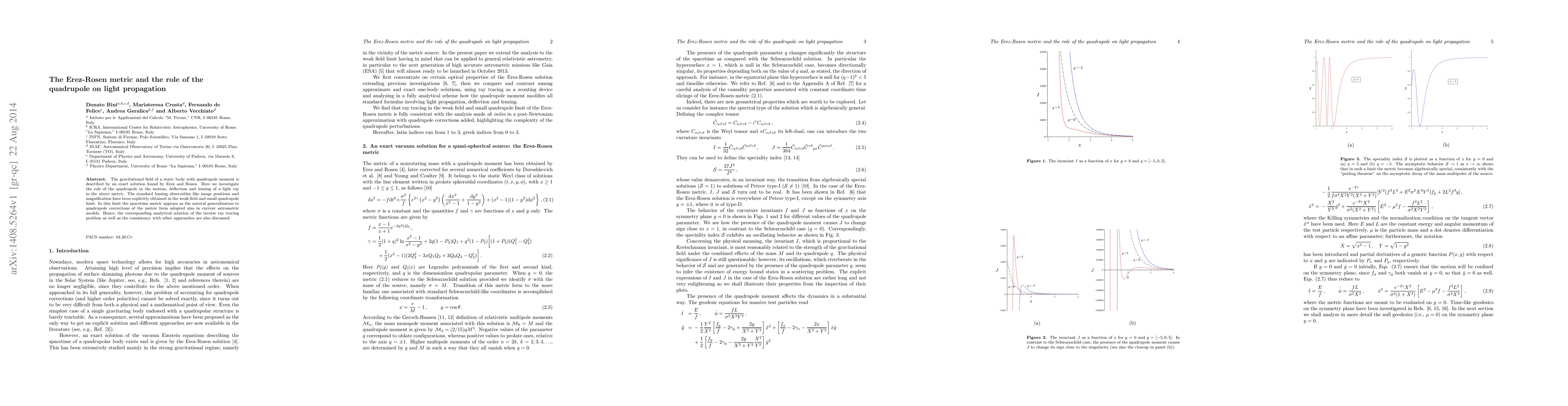 This paper investigates the gravitational effects of a static body's quadrupole moment using the Erez-Rosen metric, focusing on light propagation, deflection, and lensing. Analytical solutions for lensing observables in the weak field and small quadrupole limit are derived, showing consistency with current astrometric models.