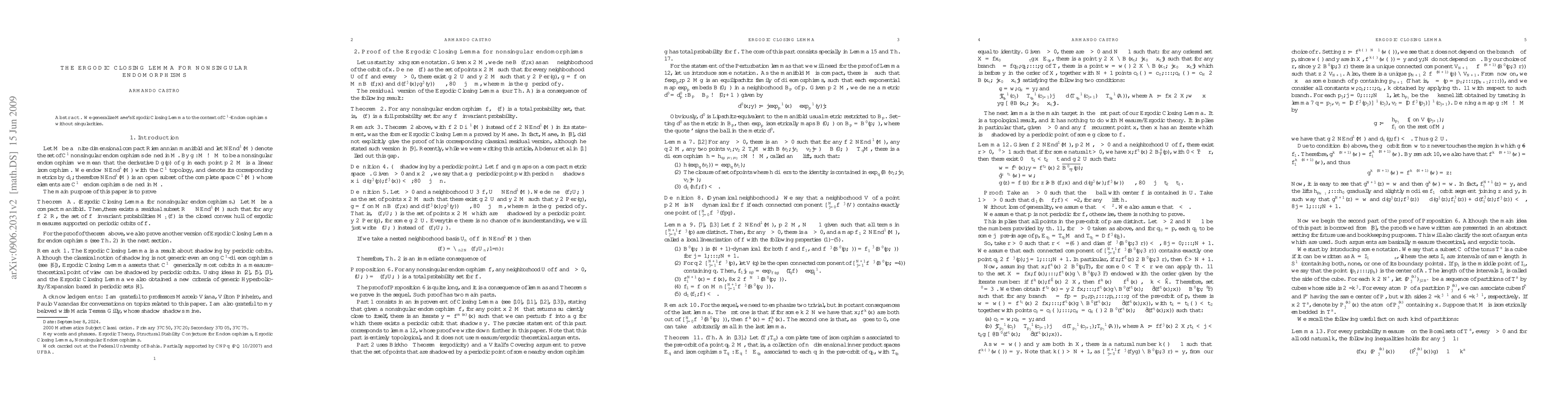 Summary: The paper establishes the ergodic Closing Lemma for nonsingular endomorphisms, providing a significant result in the study of dynamical systems and their long-term behavior. This proof contributes to a deeper understanding of the structure and stability of such systems.