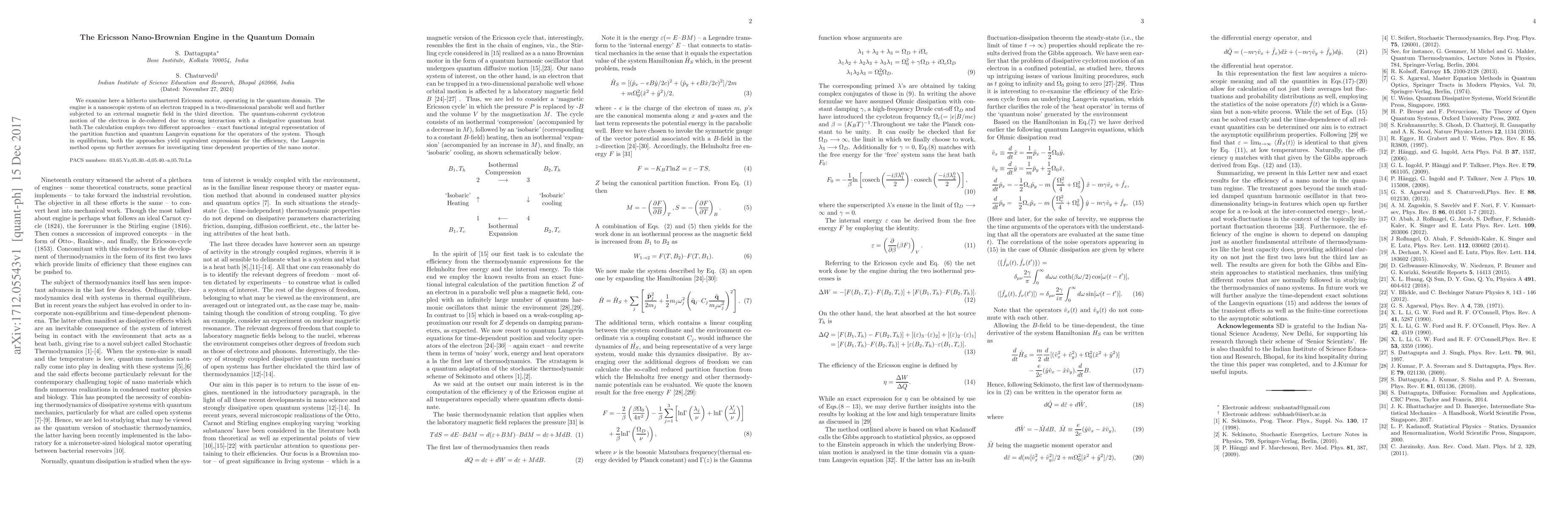 We examine here a hitherto unchartered Ericsson motor, operating in the quantum domain. The engine is a nanoscopic system of an electron trapped in a two-dimensional parabolic well and further subjected to an external magnetic field in the third direction. The quantum-coherent cyclotron motion of the electron is de-cohered due to strong interaction with a dissipative quantum heat bath.The calculation employs two different approaches - exact functional integral representation of the partition function and quantum Langevin equations for the operators of the system. Though in equilibrium, both the approaches yield equivalent expressions for the efficiency, the Langevin method opens up further avenues for investigating time dependent properties of the nano motor.