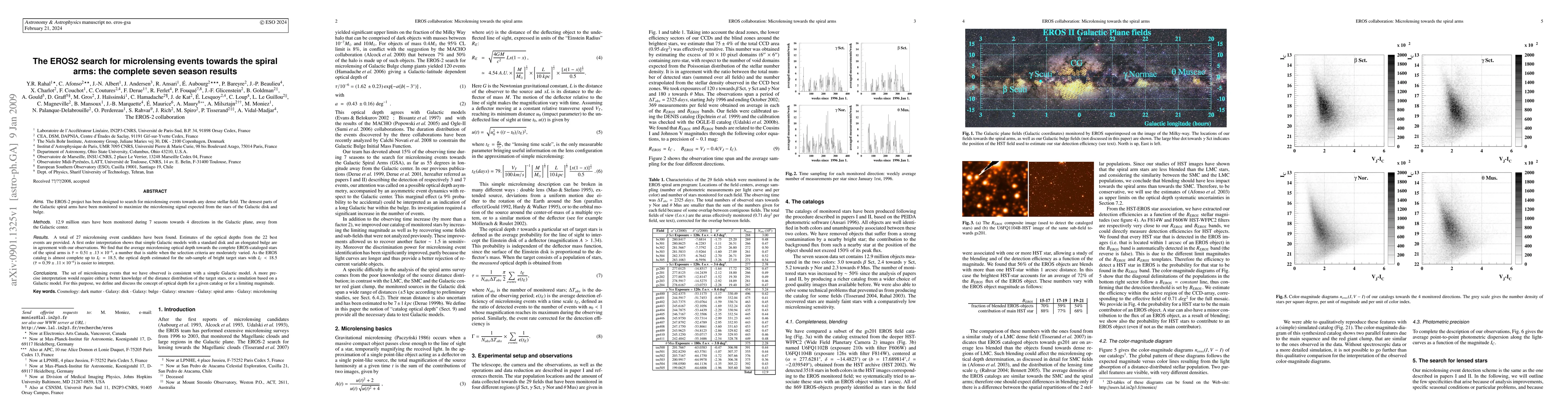 The EROS-2 project has detected 27 microlensing event candidates towards the Galactic spiral arms, with an average optical depth of 0.51 imes 10^{-6}, suggesting a simple Galactic model with a standard disk and elongated bulge.