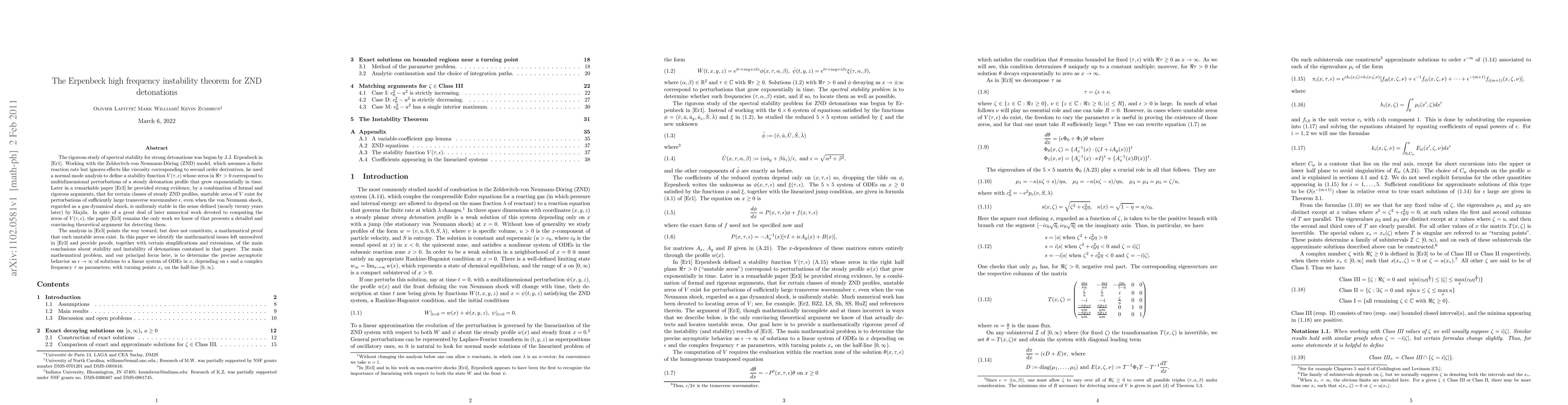 The rigorous study of spectral stability for strong detonations was begun by J.J. Erpenbeck in [Er1]. Working with the Zeldovitch-von Neumann-D\"oring (ZND) model, which assumes a finite reaction rate but ignores effects like viscosity corresponding to second order derivatives, he used a normal mode analysis to define a stability function $V(\tau,\eps)$ whose zeros in $\Re \tau>0$ correspond to multidimensional perturbations of a steady detonation profile that grow exponentially in time. Later in a remarkable paper [Er3] he provided strong evidence, by a combination of formal and rigorous arguments, that for certain classes of steady ZND profiles, unstable zeros of $V$ exist for perturbations of sufficiently large transverse wavenumber $\eps$, even when the von Neumann shock, regarded as a gas dynamical shock, is uniformly stable in the sense defined (nearly twenty years later) by Majda. In spite of a great deal of later numerical work devoted to computing the zeros of $V(\tau,\eps)$, the paper \cite{Er3} remains the only work we know of that presents a detailed and convincing theoretical argument for detecting them. The analysis in [Er3] points the way toward, but does not constitute, a mathematical proof that such unstable zeros exist. In this paper we identify the mathematical issues left unresolved in [Er3] and provide proofs, together with certain simplifications and extensions, of the main conclusions about stability and instability of detonations contained in that paper. The main mathematical problem, and our principal focus here, is to determine the precise asymptotic behavior as $\eps\to \infty$ of solutions to a linear system of ODEs in $x$, depending on $\eps$ and a complex frequency $\tau$ as parameters, with turning points $x_*$ on the half-line $[0,\infty)$.