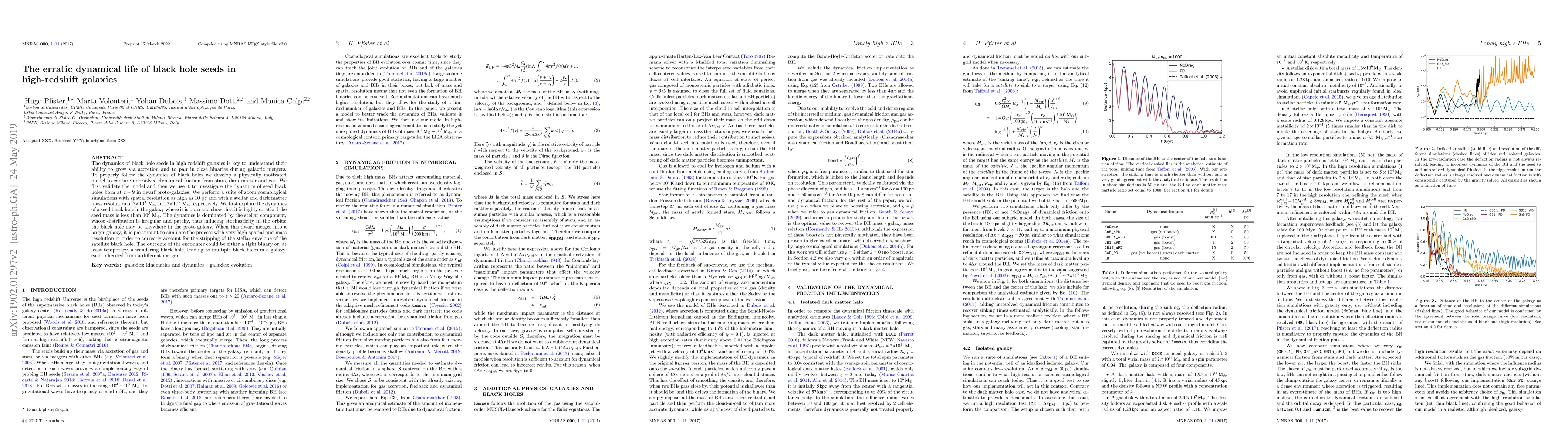 The dynamics of black hole seeds in high redshift galaxies is key to understand their ability to grow via accretion and to pair in close binaries during galactic mergers. To properly follow the dynamics of black holes we develop a physically motivated model to capture unresolved dynamical friction from stars, dark matter and gas. We first validate the model and then we use it to investigate the dynamics of seed black holes born at $z\sim9$ in dwarf proto-galaxies. We perform a suite of zoom cosmological simulations with spatial resolution as high as 10 pc and with a stellar and dark matter mass resolution of $2\times10^3 \, \textrm{M}_\odot$ and $2\times10^5 \, \textrm{M}_\odot$ respectively. We first explore the dynamics of a seed black hole in the galaxy where it is born and show that it is highly erratic if the seed mass is less than $10^5\, \textrm{M}_\odot$. The dynamics is dominated by the stellar component, whose distribution is irregular and patchy, thus inducing stochasticity in the orbits: the black hole may be anywhere in the proto-galaxy. When this dwarf merges into a larger galaxy, it is paramount to simulate the process with very high spatial and mass resolution in order to correctly account for the stripping of the stellar envelope of the satellite black hole. The outcome of the encounter could be either a tight binary or, at least temporary, a wandering black hole, leading to multiple black holes in a galaxy, each inherited from a different merger.