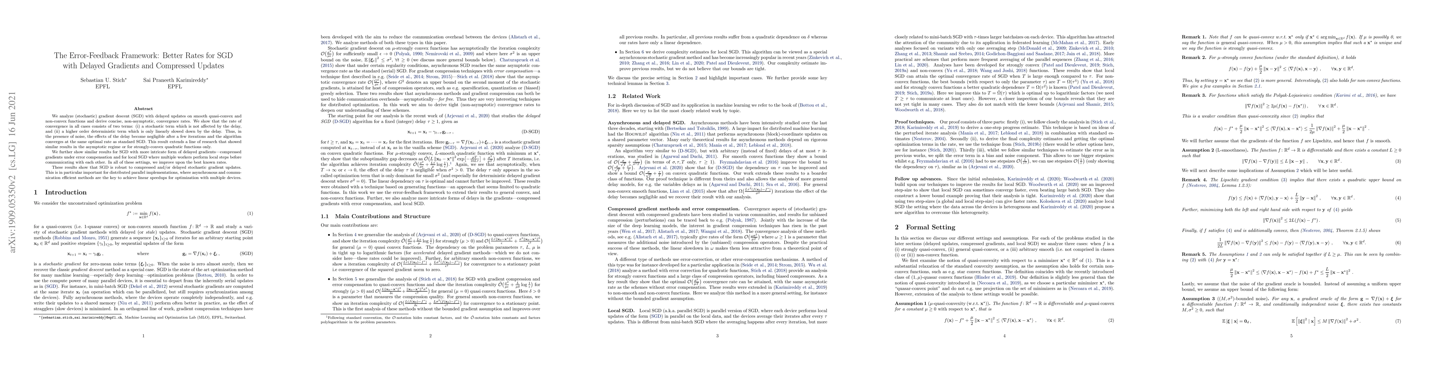 We analyze (stochastic) gradient descent (SGD) with delayed updates on smooth quasi-convex and non-convex functions and derive concise, non-asymptotic, convergence rates. We show that the rate of convergence in all cases consists of two terms: (i) a stochastic term which is not affected by the delay, and (ii) a higher order deterministic term which is only linearly slowed down by the delay. Thus, in the presence of noise, the effects of the delay become negligible after a few iterations and the algorithm converges at the same optimal rate as standard SGD. This result extends a line of research that showed similar results in the asymptotic regime or for strongly-convex quadratic functions only. We further show similar results for SGD with more intricate form of delayed gradients -- compressed gradients under error compensation and for local~SGD where multiple workers perform local steps before communicating with each other. In all of these settings, we improve upon the best known rates. These results show that SGD is robust to compressed and/or delayed stochastic gradient updates. This is in particular important for distributed parallel implementations, where asynchronous and communication efficient methods are the key to achieve linear speedups for optimization with multiple devices.