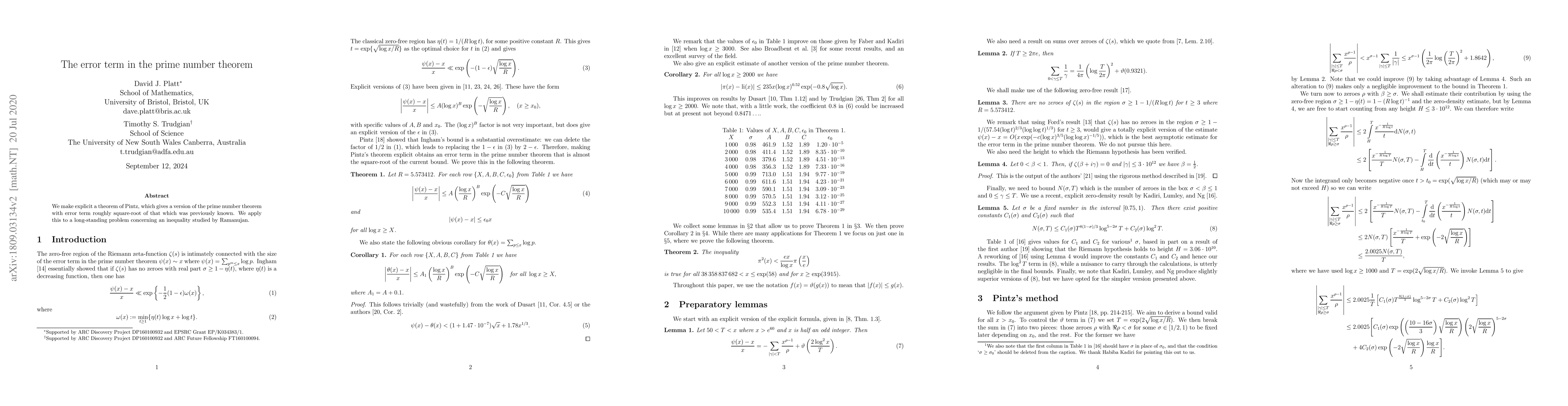 We make explicit a theorem of Pintz concerning the error term in the prime number theorem. This gives an improved version of the prime number theorem with error term roughly square-root of that which was previously known. We apply this to a long-standing problem concerning an inequality studied by Ramanujan.