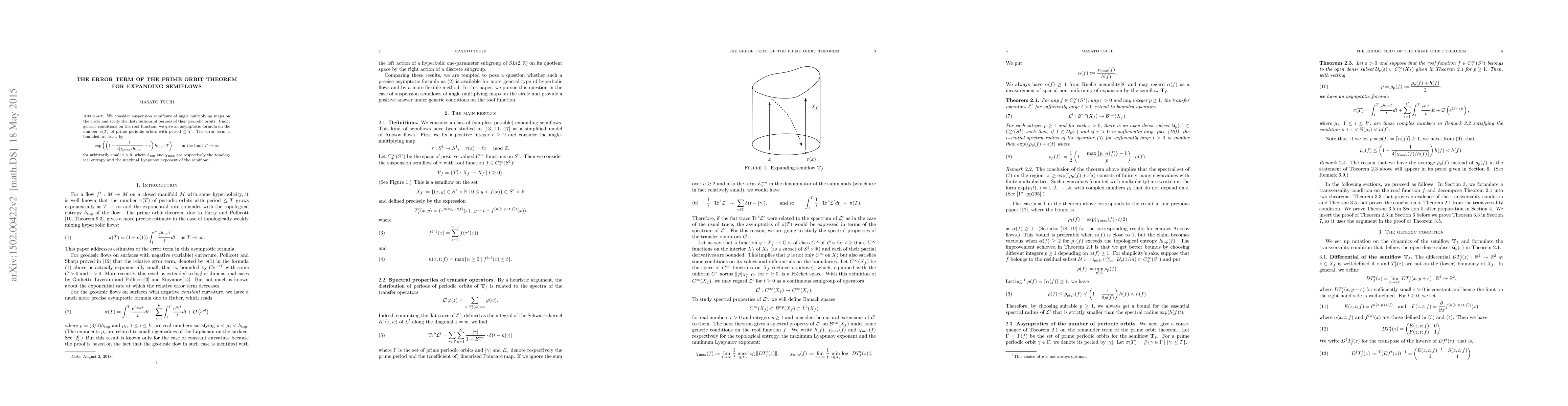 We consider suspension semiflows of an angle multiplying map on the circle and study the distributions of periods of their periodic orbits. Under generic conditions on the roof function, we give an asymptotic formula on the number $\pi(T)$ of prime periodic orbits with period $\le T$. The error term is bounded, at least, by \[ \exp((1-\frac{1}{4\lceil \chi_{\max}/h_{\mathrm{top}}\rceil}+\varepsilon) h_{\top} T)\qquad {in the limit $T\to \infty$} \] for arbitrarily small $\varepsilon>0$, where $h_{\mathrm{top}}$ and $\chi_{\max}$ are respectively the topological entropy and the maximal Lyapunov exponent of the semiflow.