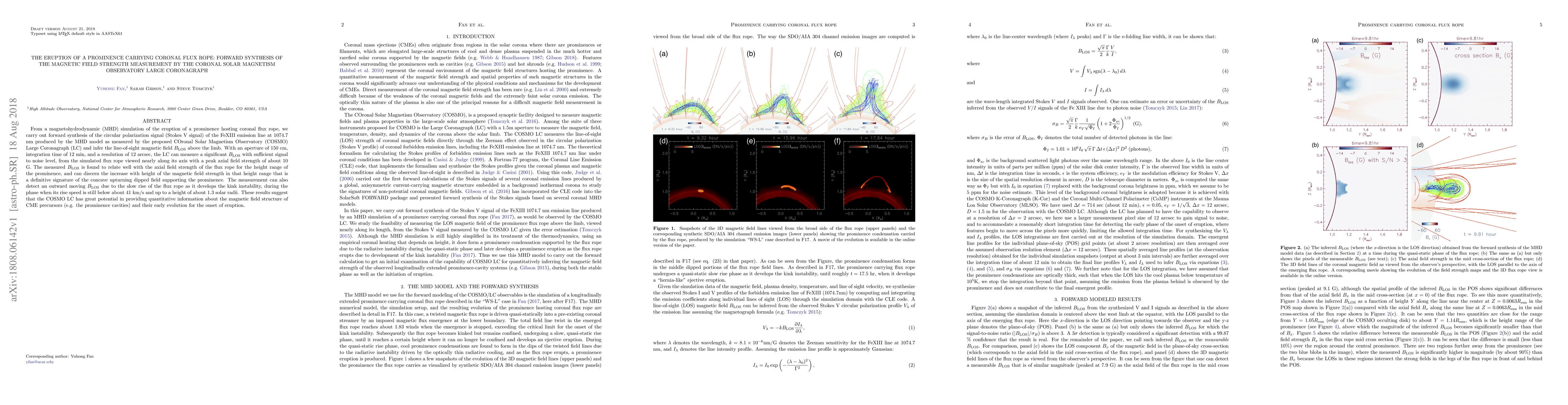 From a magnetohydrodynamic (MHD) simulation of the eruption of a prominence hosting coronal flux rope, we carry out forward synthesis of the circular polarization signal (Stokes V signal) of the FeXIII emission line at 1074.7 nm produced by the MHD model as measured by the proposed COronal Solar Magnetism Observatory (COSMO) Large Coronagraph (LC) and infer the line-of-sight magnetic field BLOS above the limb. With an aperture of 150 cm, integration time of 12 min, and a resolution of 12 arcsec, the LC can measure a significant BLOS with sufficient signal to noise level, from the simulated flux rope viewed nearly along its axis with a peak axial field strength of about 10 G. The measured BLOS is found to relate well with the axial field strength of the flux rope for the height range of the prominence, and can discern the increase with height of the magnetic field strength in that height range that is a definitive signature of the concave upturning dipped field supporting the prominence. The measurement can also detect an outward moving BLOS due to the slow rise of the flux rope as it develops the kink instability, during the phase when its rise speed is still below about 41 km/s and up to a height of about 1.3 solar radii. These results suggest that the COSMO LC has great potential in providing quantitative information about the magnetic field structure of CME precursors (e.g. the prominence cavities) and their early evolution for the onset of eruption.