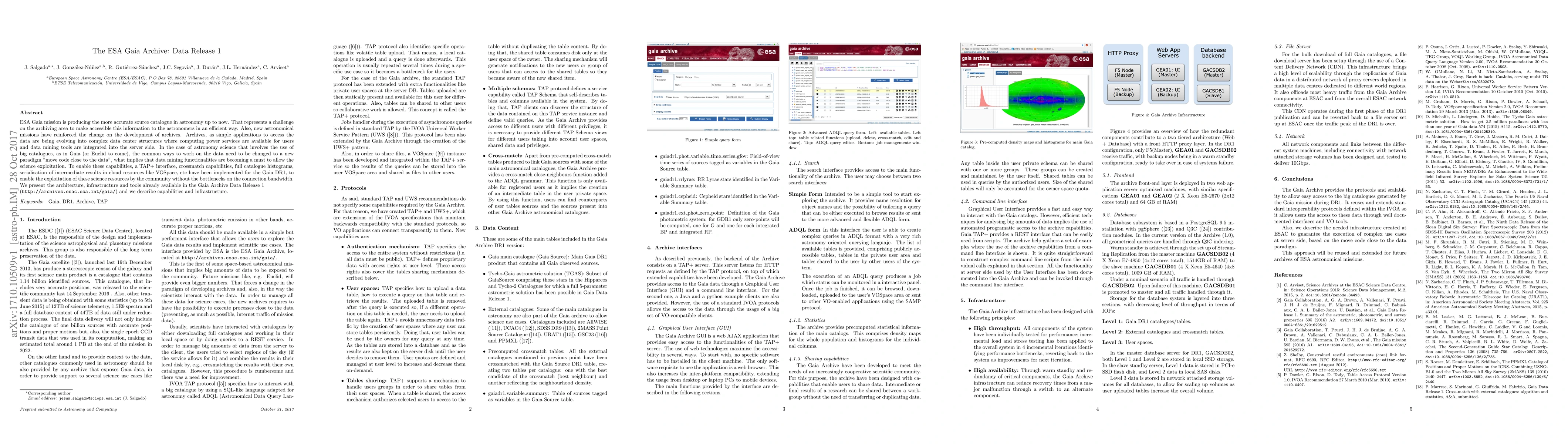ESA Gaia mission is producing the more accurate source catalogue in astronomy up to now. That represents a challenge on the archiving area to make accessible this information to the astronomers in an efficient way. Also, new astronomical missions have reinforced the change on the development of archives. Archives, as simple applications to access the data are being evolving into complex data center structures where computing power services are available for users and data mining tools are integrated into the server side. In the case of astronomy science that involves the use of big catalogues, as in Gaia (or Euclid to come), the common ways to work on the data need to be changed to a new paradigm "move code close to the data", what implies that data mining functionalities are becoming a must to allow the science exploitation. To enable these capabilities, a TAP+ interface, crossmatch capabilities, full catalogue histograms, serialisation of intermediate results in cloud resources like VOSpace, etc have been implemented for the Gaia DR1, to enable the exploitation of these science resources by the community without the bottlenecks on the connection bandwidth. We present the architecture, infrastructure and tools already available in the Gaia Archive Data Release 1 (http://archives.esac.esa.int/gaia/) and we describe capabilities and infrastructure.