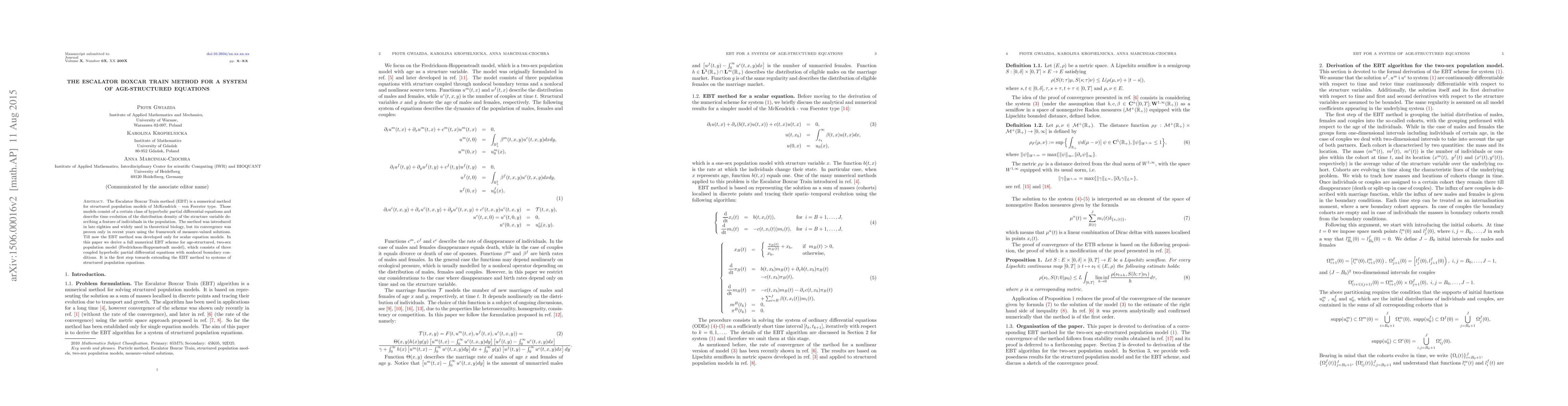 The Escalator Boxcar Train method (EBT) is a numerical method for structured population models of McKendrick-von Foerster type. Those models consist of a certain class of hyperbolic partial differential equations and describe time evolution of the distribution density of the structure variable describing a feature of individuals in the population. The method was introduced in late eighties and widely used in theoretical biology, but its convergence was proven only in recent years using the framework of measure-valued solutions. Till now the EBT method was developed only for scalar equation models. In this paper we derive a full numerical EBT scheme for age-structured, two-sex population model (Fredrickson-Hoppensteadt model), which consists of three coupled hyperbolic partial differential equations with nonlocal boundary conditions. It is the first step towards extending the EBT method to systems of structured population equations.
