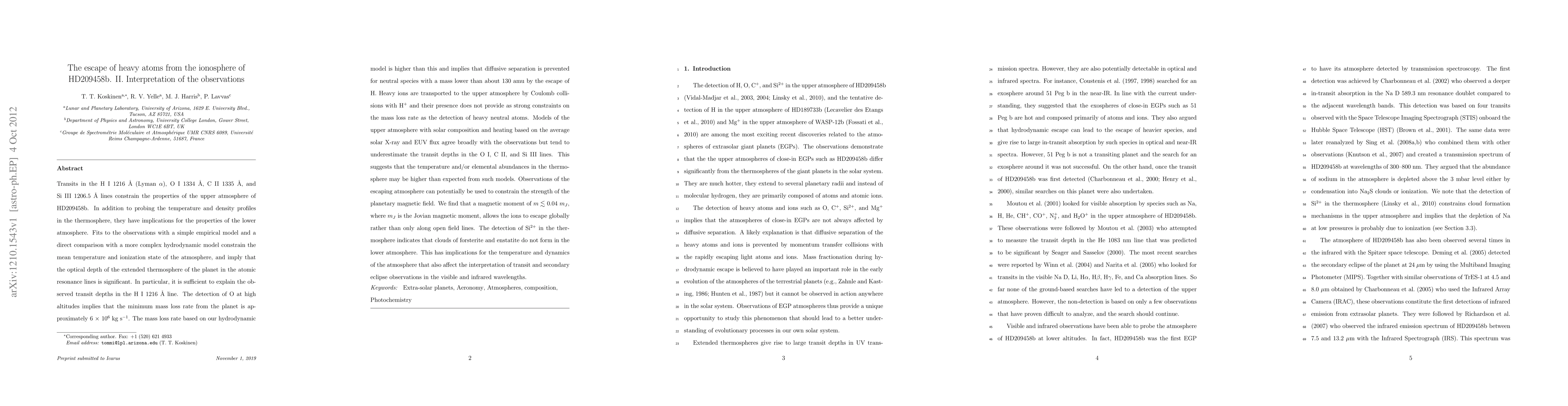 This paper analyzes transit observations of HD209458b in various atomic lines to infer the properties of its upper atmosphere, including temperature, density, and ionization state. The findings suggest significant mass loss, with heavy ions transported by hydrogen escape, and indicate that current solar-based models may underestimate thermosphere temperatures and elemental abundances.