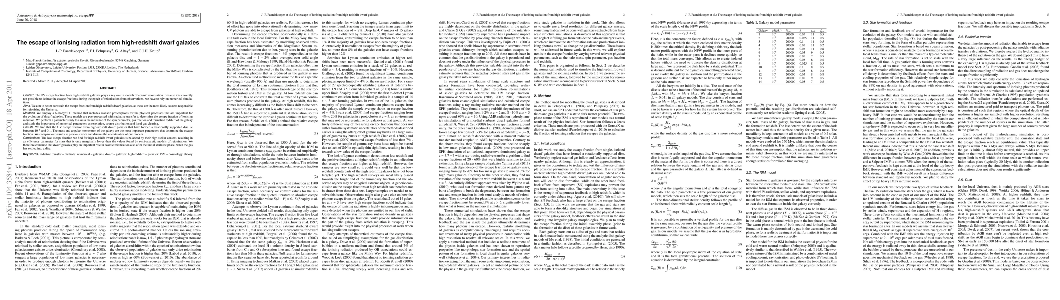 This paper investigates the escape fraction of ionising radiation from high-redshift dwarf galaxies using numerical simulations, finding that the UV escape fraction ranges from 1e-5 to 0.1. The study highlights the importance of galaxy mass and angular momentum in determining this fraction, concluding that despite a relatively low escape rate, dwarf galaxies significantly contribute to cosmic reionisation.