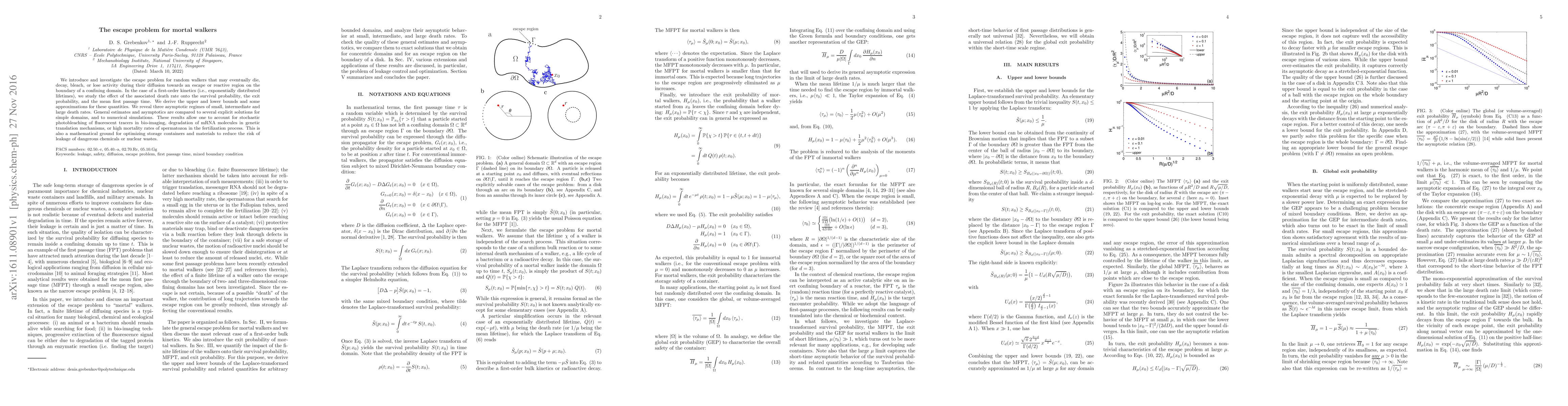 This research investigates the escape problem for mortal walkers with finite lifetimes, exploring how death rates affect survival probability, exit time, and mean passage time in different asymptotic regimes.