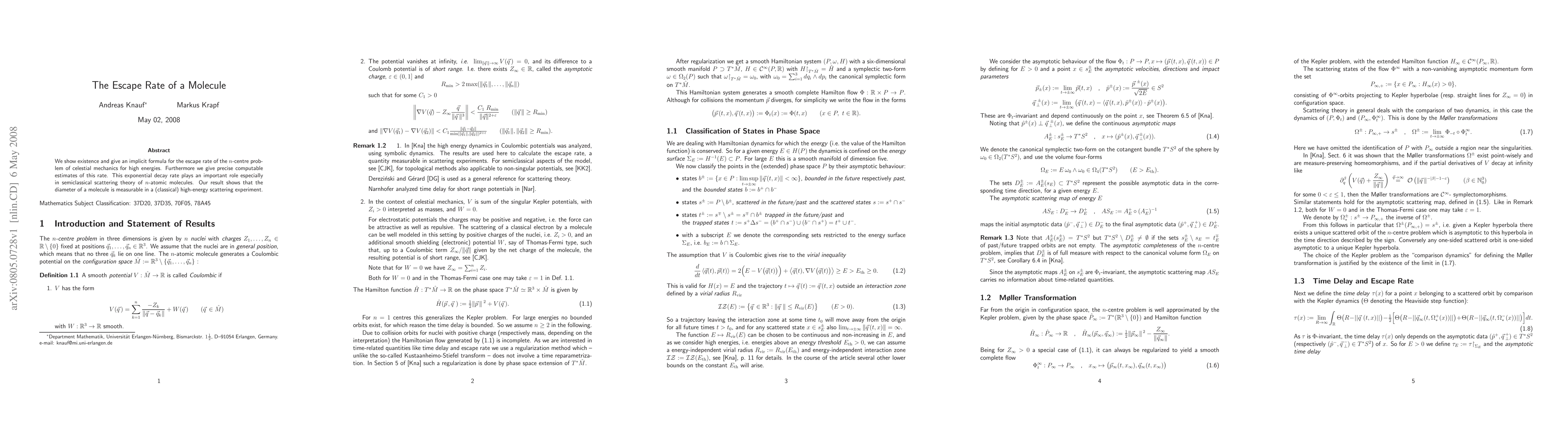 We show existence and give an implicit formula for the escape rate of the n-centre problem of celestial mechanics for high energies. Furthermore we give precise computable estimates of this rate. This exponential decay rate plays an important role especially in semiclassical scattering theory of n-atomic molecules. Our result shows that the diameter of a molecule is measurable in a (classical) high-energy scattering experiment.