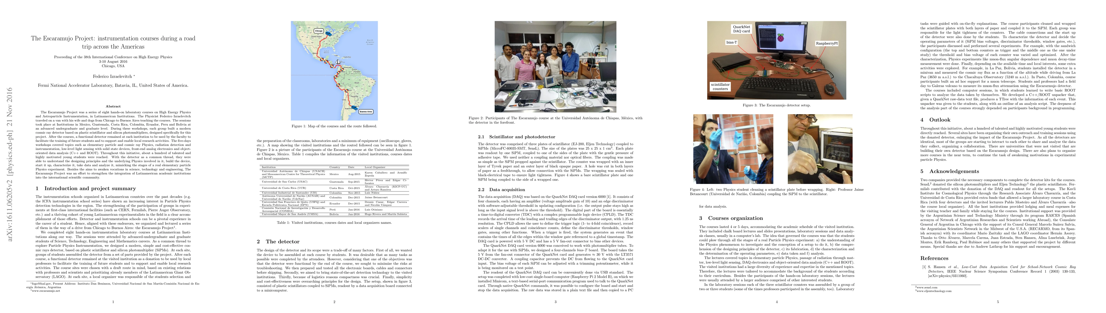 The Escaramujo Project was a series of eight hands-on laboratory courses on High Energy Physics and Astroparticle Instrumentation, in Latinamerican Institutions. The Physicist Federico Izraelevitch traveled on a van with his wife and dogs from Chicago to Buenos Aires teaching the courses. The sessions took place at Institutions in Mexico, Guatemala, Costa Rica, Colombia, Ecuador, Peru and Bolivia at an advanced undergraduate and graduate level. During these workshops, each group built a modern cosmic ray detector based on plastic scintillator and silicon photomultipliers, designed specifically for this project. After the courses, a functional detector remained at each institution to be used by the faculty to facilitate the training of future students and to support and enable local research activities. The five-days workshops covered topics such as elementary particle and cosmic ray Physics, radiation detection and instrumentation, low-level light sensing with solid state devices, front-end analog electronics and object-oriented data analysis (C++ and ROOT). Throughout this initiative, about a hundred of talented and highly motivated young students were reached. With the detector as a common thread, they were able to understand the designing principles and the underlying Physics involved in it, build the device, start it up, characterize it, take data and analyze it, mimicking the stages of a real elementary particle Physics experiment. Besides the aims to awaken vocations in science, technology and engineering, The Escaramujo Project was an effort to strengthen the integration of Latinamerican academic institutions into the international scientific community.