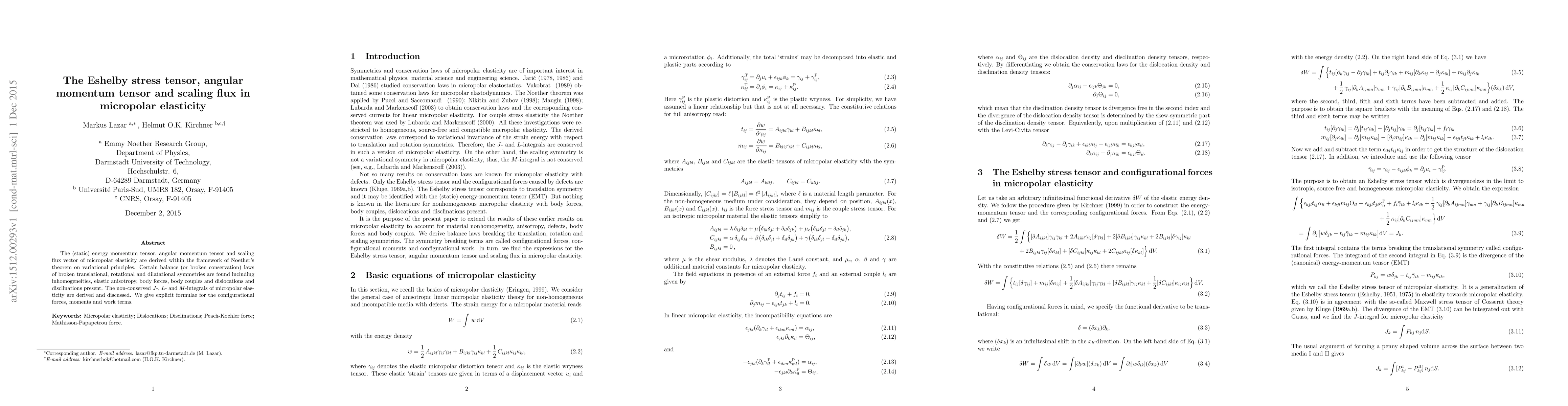 This paper derives the energy momentum tensor, angular momentum tensor, and scaling flux vector in micropolar elasticity using Noether's theorem, identifying balance laws for broken symmetries including inhomogeneities and elastic anisotropy. It also discusses non-conserved integrals and provides explicit formulae for configurational forces, moments, and work terms.