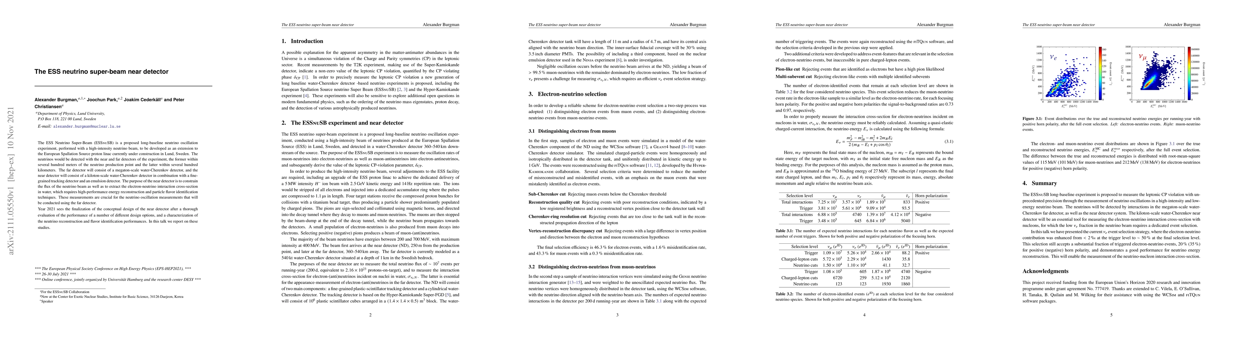 The ESS Neutrino Super-Beam (ESSnuSB) is a proposed long-baseline neutrino oscillation experiment, performed with a high-intensity neutrino beam, to be developed as an extension to the European Spallation Source proton linac currently under construction in Lund, Sweden. The neutrinos would be detected with the near and far detectors of the experiment, the former within several hundred meters of the neutrino production point and the latter within several hundred kilometers. The far detector will consist of a megaton-scale water-Cherenkov detector, and the near detector will consist of a kiloton-scale water-Cherenkov detector in combination with a fine-grained tracking detector and an emulsion detector. The purpose of the near detector is to constrain the flux of the neutrino beam as well as to extract the electron-neutrino interaction cross-section in water, which requires high-performance energy reconstruction and particle flavor identification techniques. These measurements are crucial for the neutrino oscillation measurements that will be conducted using the far detector. Year 2021 sees the finalization of the conceptual design of the near detector after a thorough evaluation of the performance of a number of different design options, and a characterization of the neutrino reconstruction and flavor identification performances. In this talk we report on thesestudies.