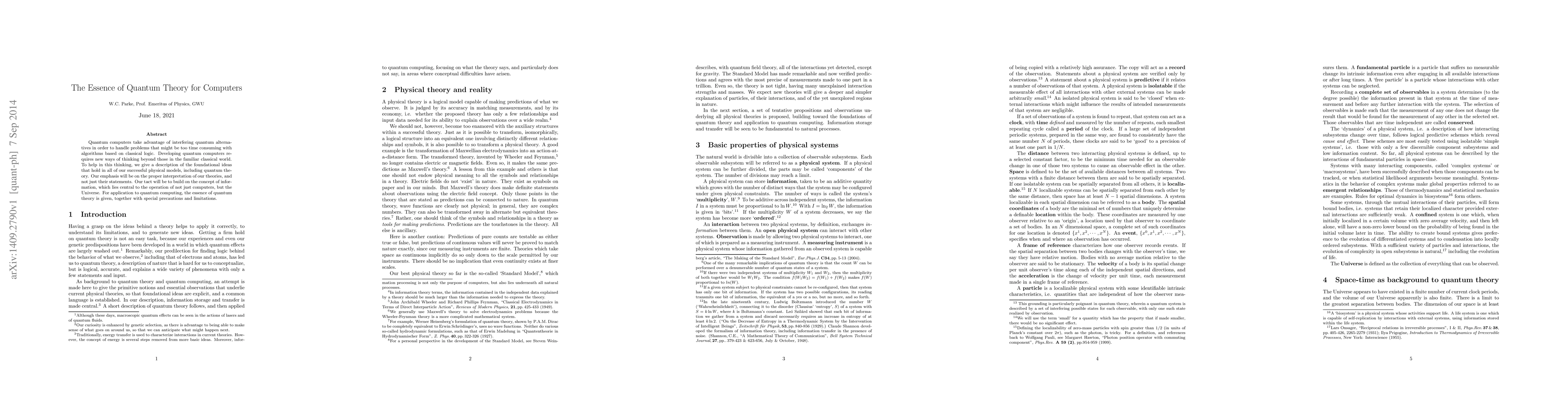 Quantum computers take advantage of interfering quantum alternatives in order to handle problems that might be too time consuming with algorithms based on classical logic. Developing quantum computers requires new ways of thinking beyond those in the familiar classical world. To help in this thinking, we give a description of the foundational ideas that hold in all of our successful physical models, including quantum theory. Our emphasis will be on the proper interpretation of our theories, and not just their statements. Our tact will be to build on the concept of information, which lies central to the operation of not just computers, but the Universe. For application to quantum computing, the essence of quantum theory is given, together with special precautions and limitations.