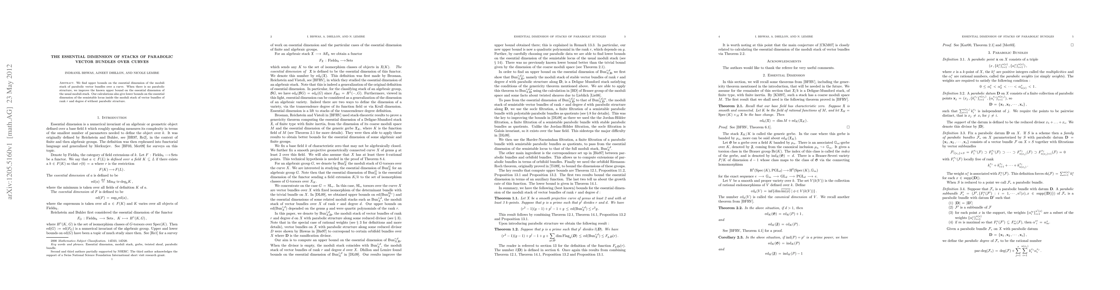 We find upper bounds on the essential dimension of the moduli stack of parabolic vector bundles over a curve. When there is no parabolic structure, we improve the known upper bound on the essential dimension of the usual moduli stack. Our calculations also give lower bounds on the essential dimension of the semistable locus inside the moduli stack of vector bundles of rank $r$ and degree $d$ without parabolic structure.