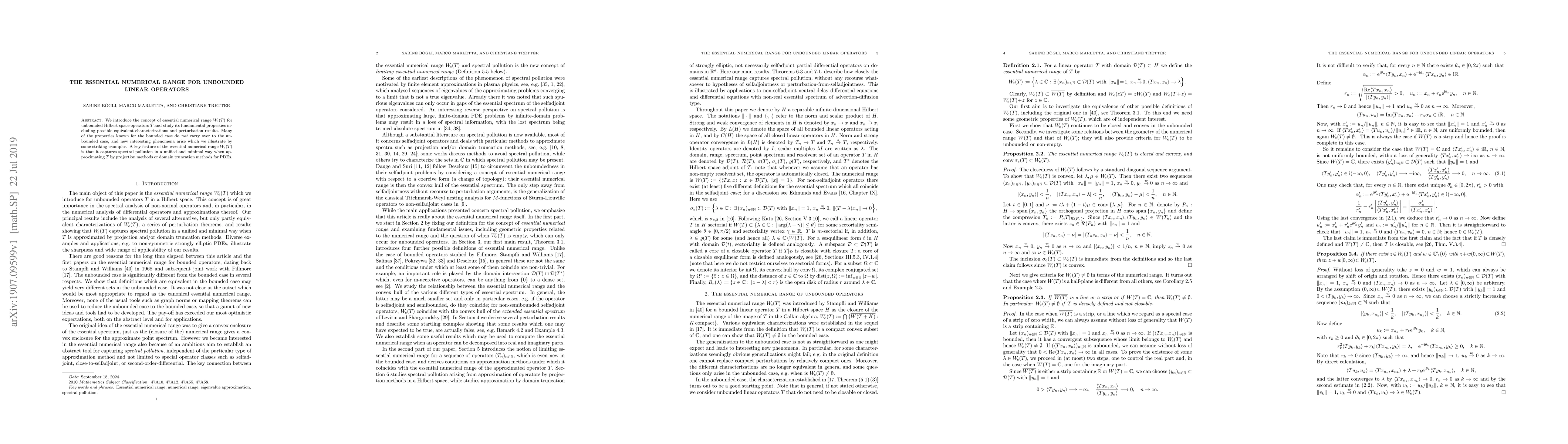 This paper introduces the concept of essential numerical range for unbounded linear operators, exploring its properties and implications for approximating operators in PDEs. It reveals new phenomena and characterizations compared to the bounded case, highlighting its role in capturing spectral pollution.